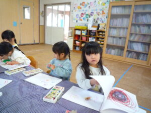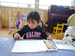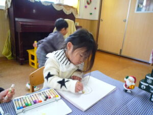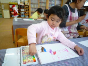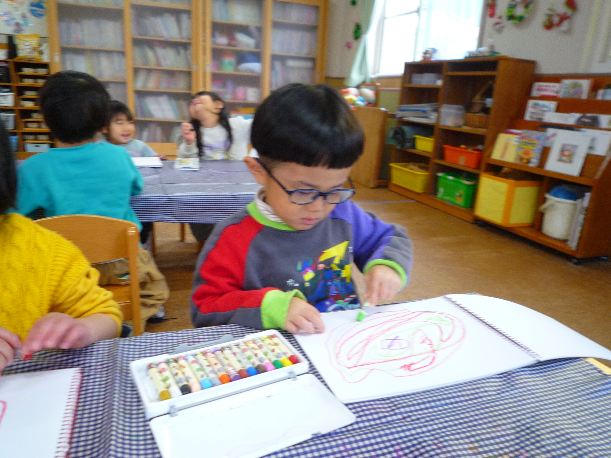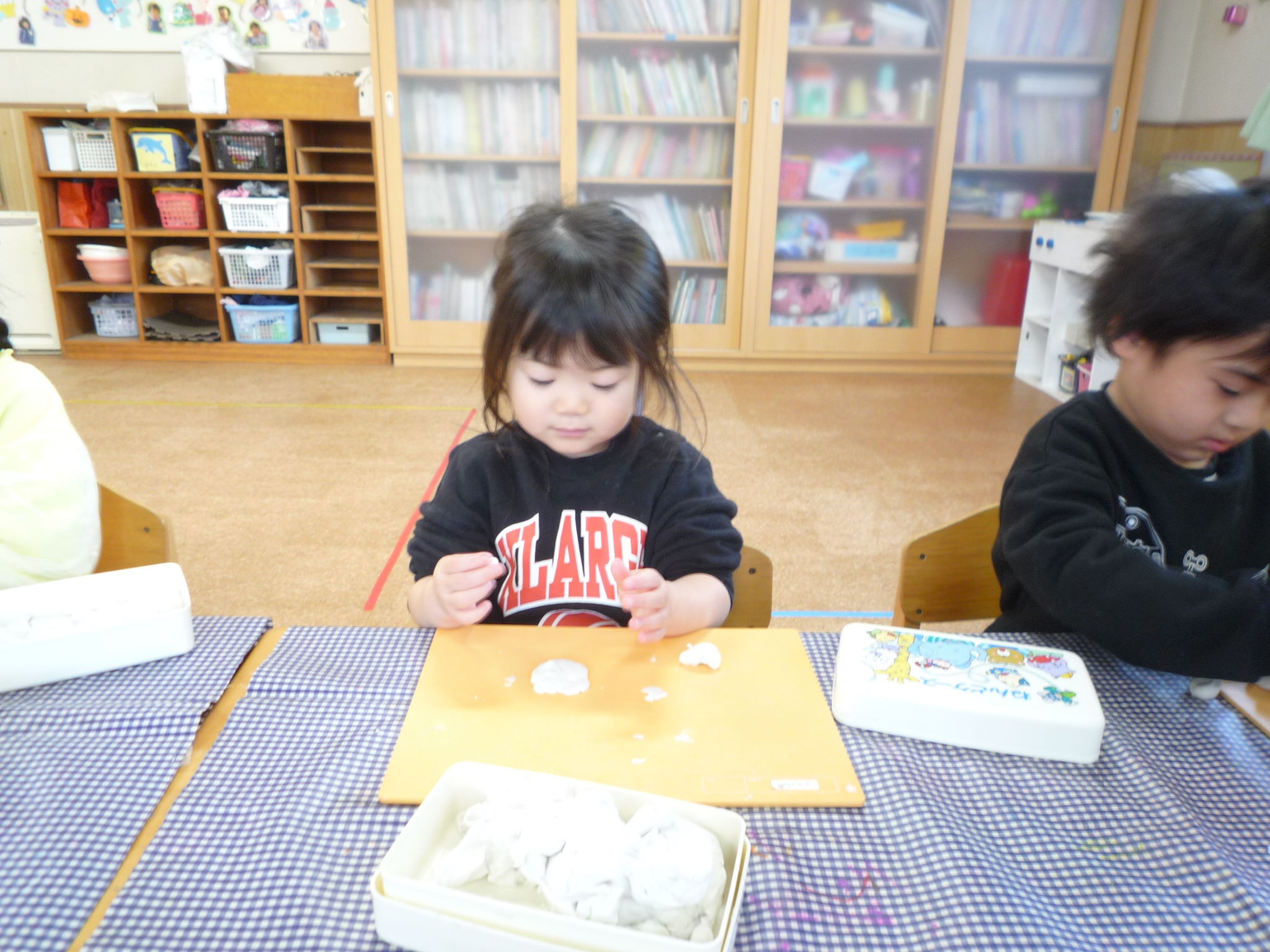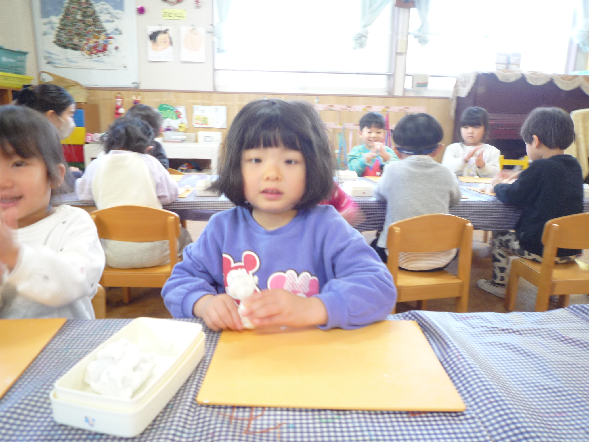クリスマス会の思い出を自由画帳にお絵描きしました♡サンタさんやクリスマスツリーお母さんお父さんなど思い思いに絵を描く子どもたちでした♡粘土あそびでは色々な大きさの丸を作って色んなものに見立てて遊びました!雪だるまやピザ車のタイヤなど丸いものを考えて作っていてみんなの発想が面白かったです(^^)/