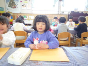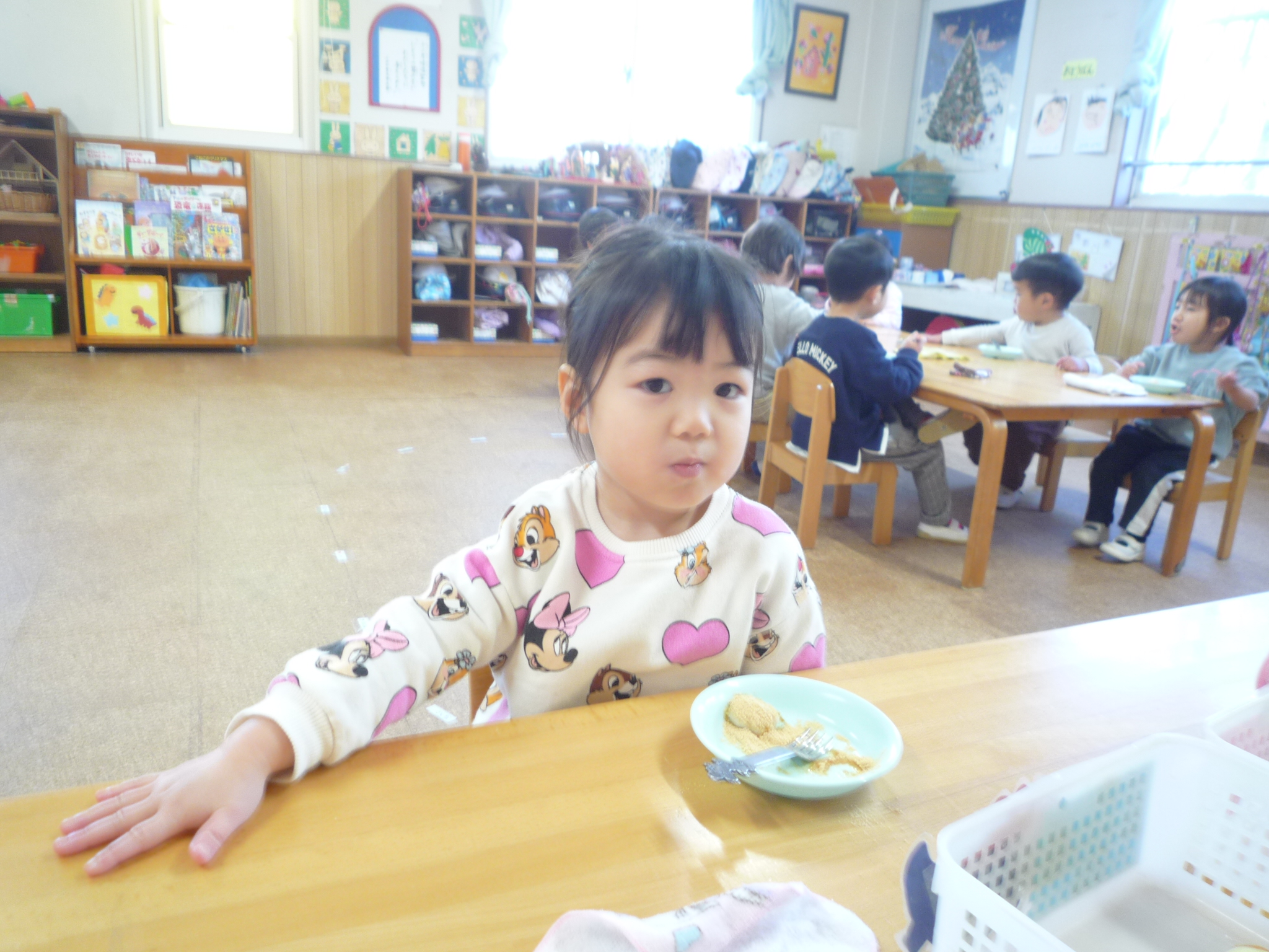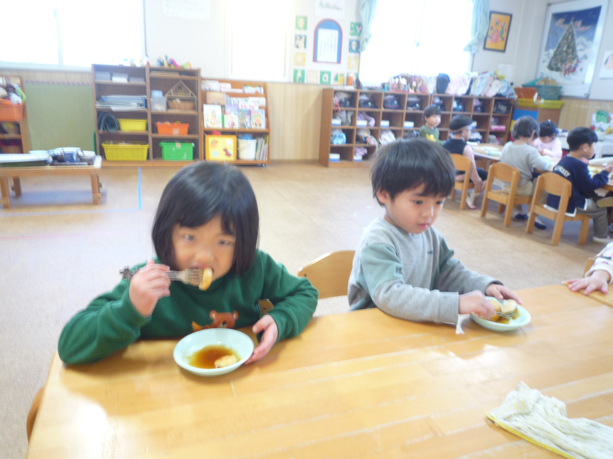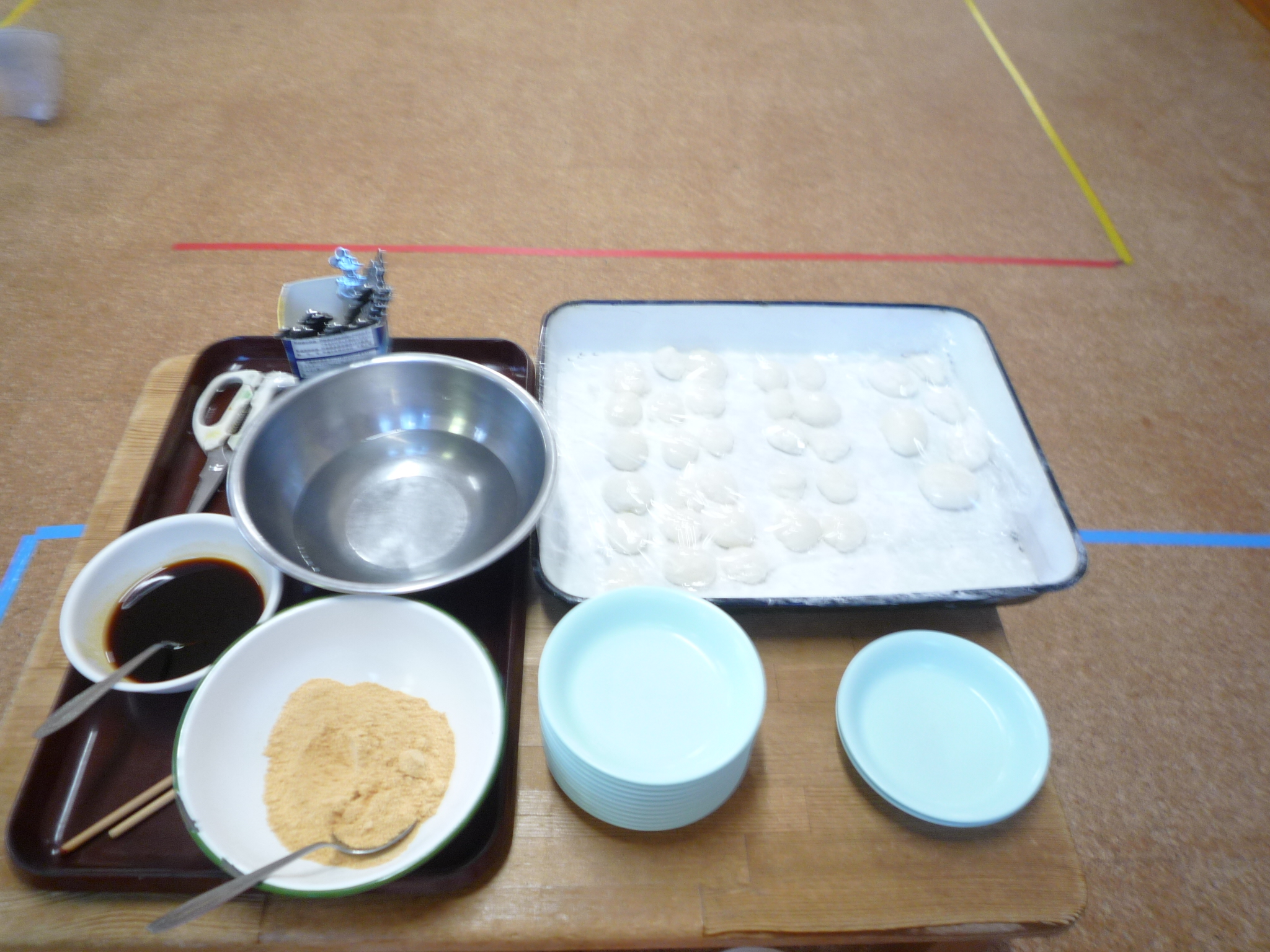 今日は、おもちつきがありました(^^♪朝から子どもたちはとっても楽しみにしていて、「今日はおもちつき?」「いっぱい食べるぞ~」と意気込む子どもたちでした♬たんぽぽ組のお友だちは初めてのお餅つき!「よいしょー」の掛け声で年の数だけお餅をつきました(^▽^)/その後は、きなこと醤油味を選んでお餅を食べました♡美味しかったね!