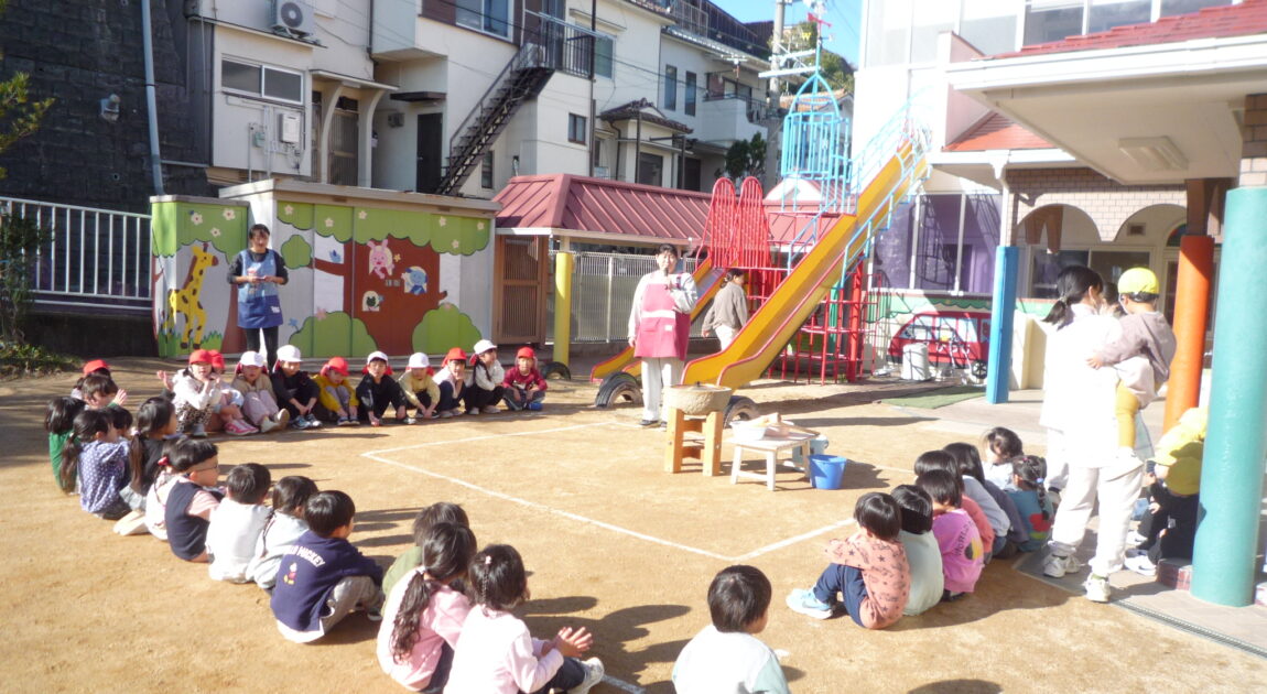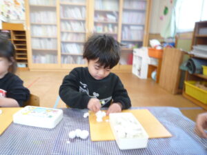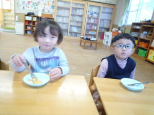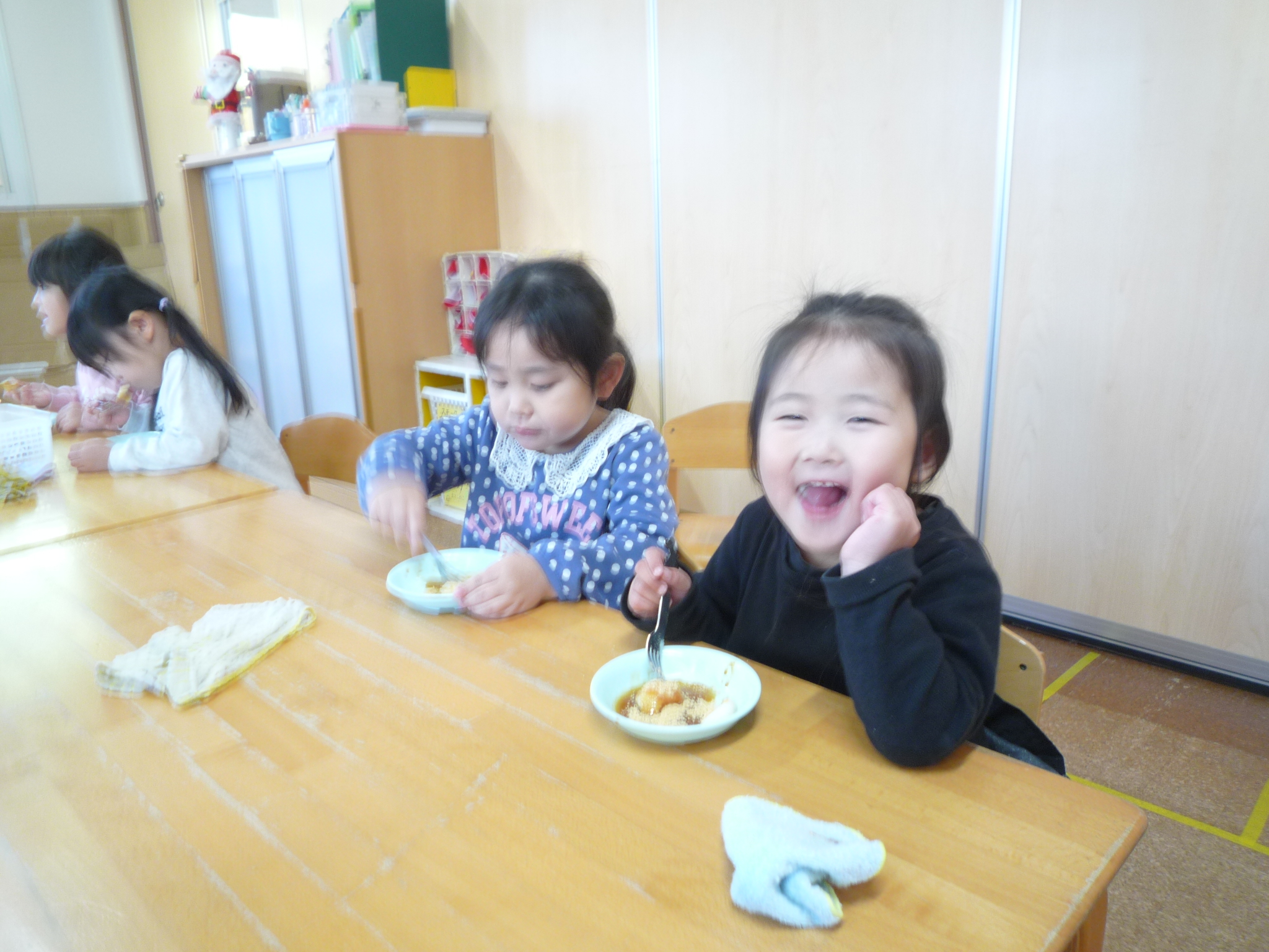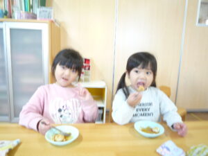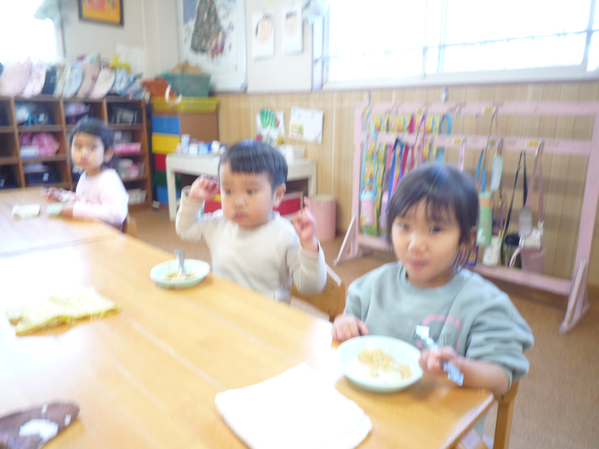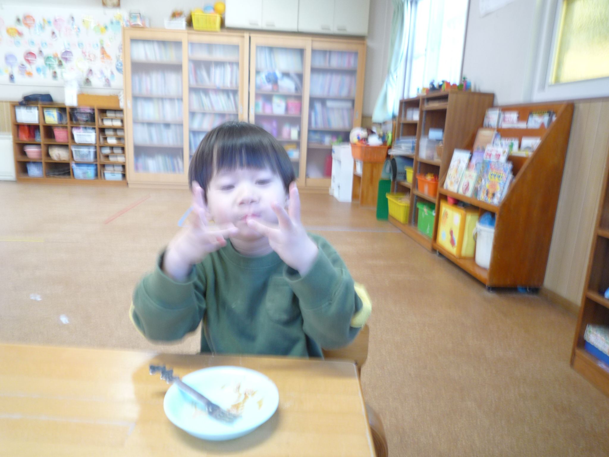 今日は、おもちつきがありました(^^♪朝から子どもたちはとっても楽しみにしていて、「今日はおもちつき?」「いっぱい食べるぞ~」と意気込む子どもたちでした♬たんぽぽ組のお友だちは初めてのお餅つき!「よいしょー」の掛け声で年の数だけお餅をつきました(^▽^)/その後は、きなこと醤油味を選んでお餅を食べました♡美味しかったね!