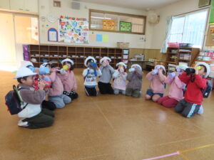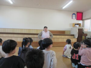 今日から3学期が始まり、始園式をみんなで行いました。新年のあいさつをして讃美歌やお祈りをした後は、丸山先生のお話を聞きました。このクラスで過ごすのもあと少しみんな元気に幼稚園に登園できますように・・・