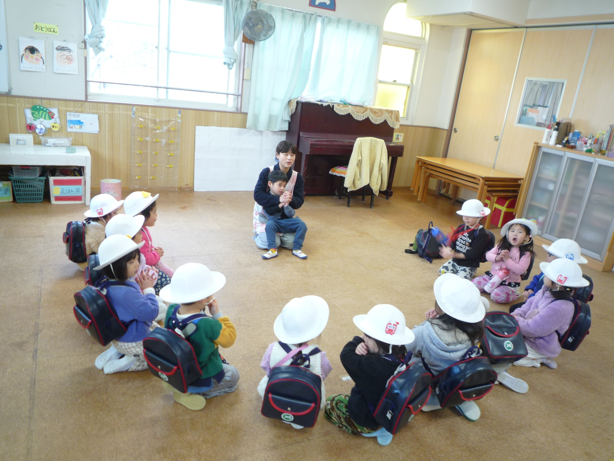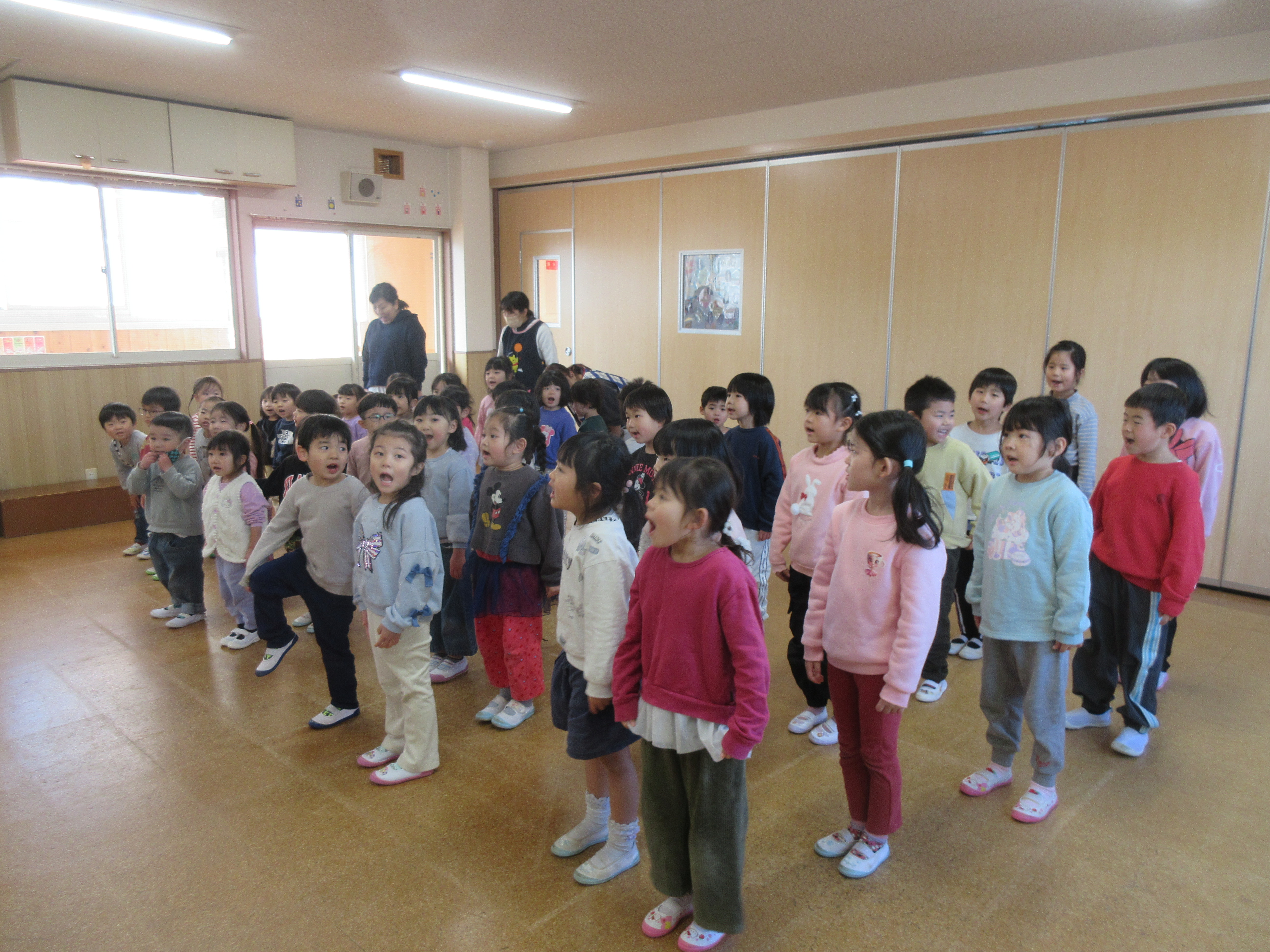 今日から3学期が始まり、始園式をみんなで行いました。新年のあいさつをして讃美歌やお祈りをした後は、丸山先生のお話を聞きました。このクラスで過ごすのもあと少しみんな元気に幼稚園に登園できますように・・・