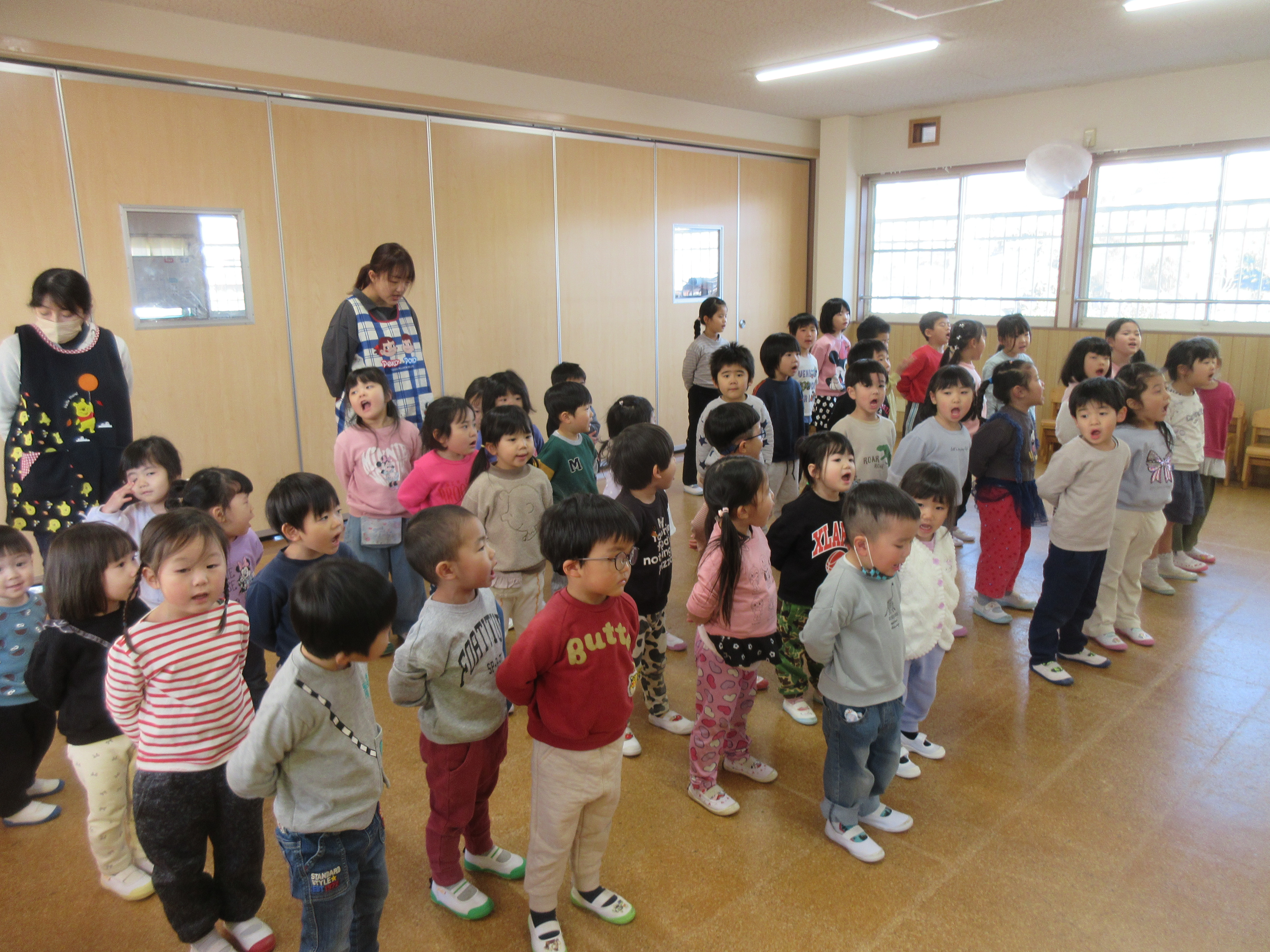 明日から1日保育が始まりますのでお弁当の準備をお願いします。また、年長・年中組さんは身体測定がありますので脱ぎ着しやすい服装と、髪の長い子は低い場所でくっくて頂けると嬉しいです。