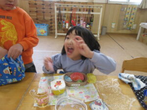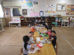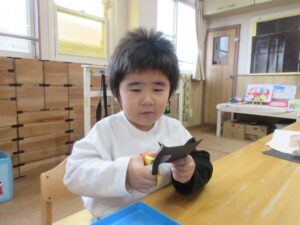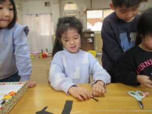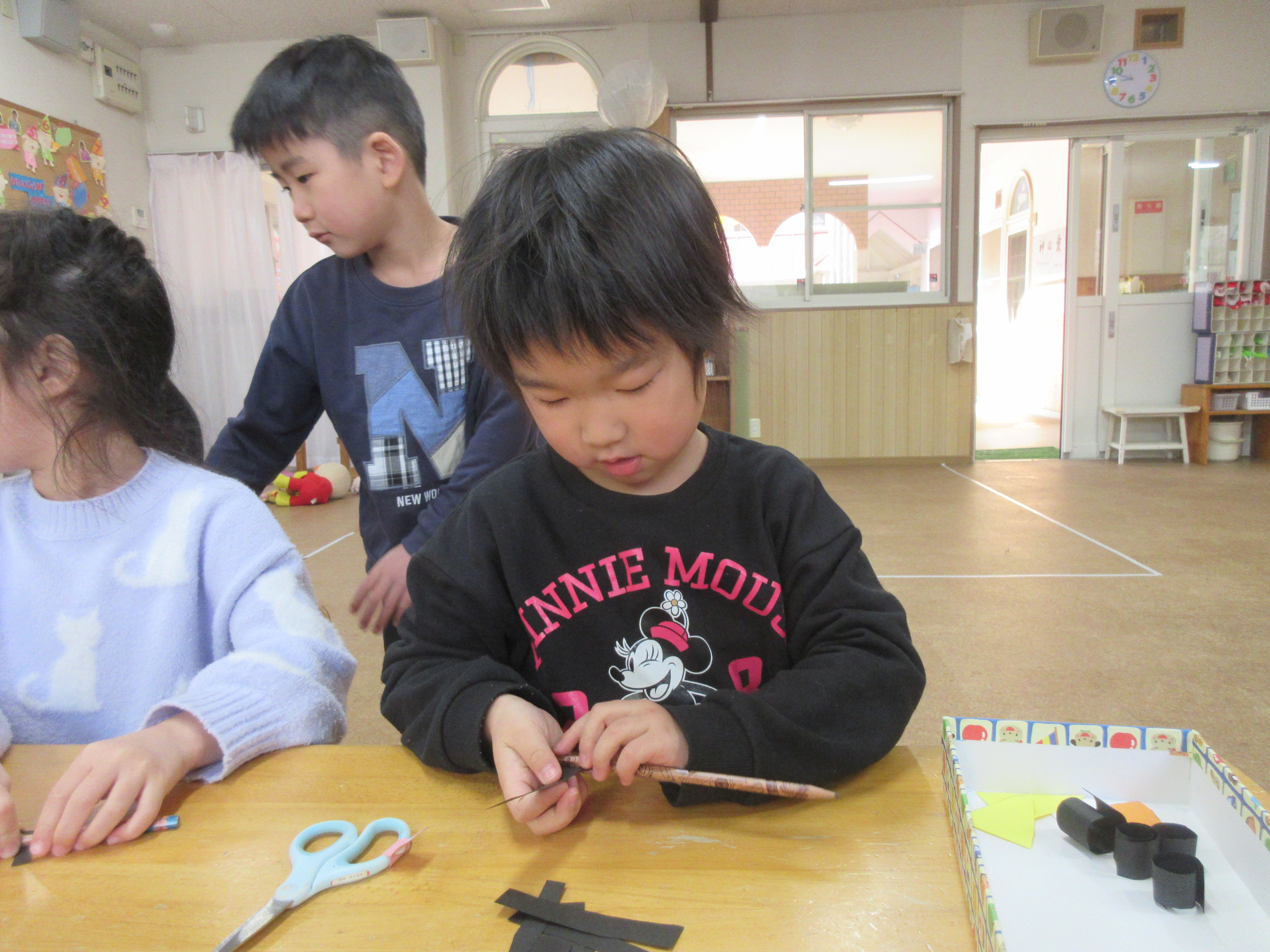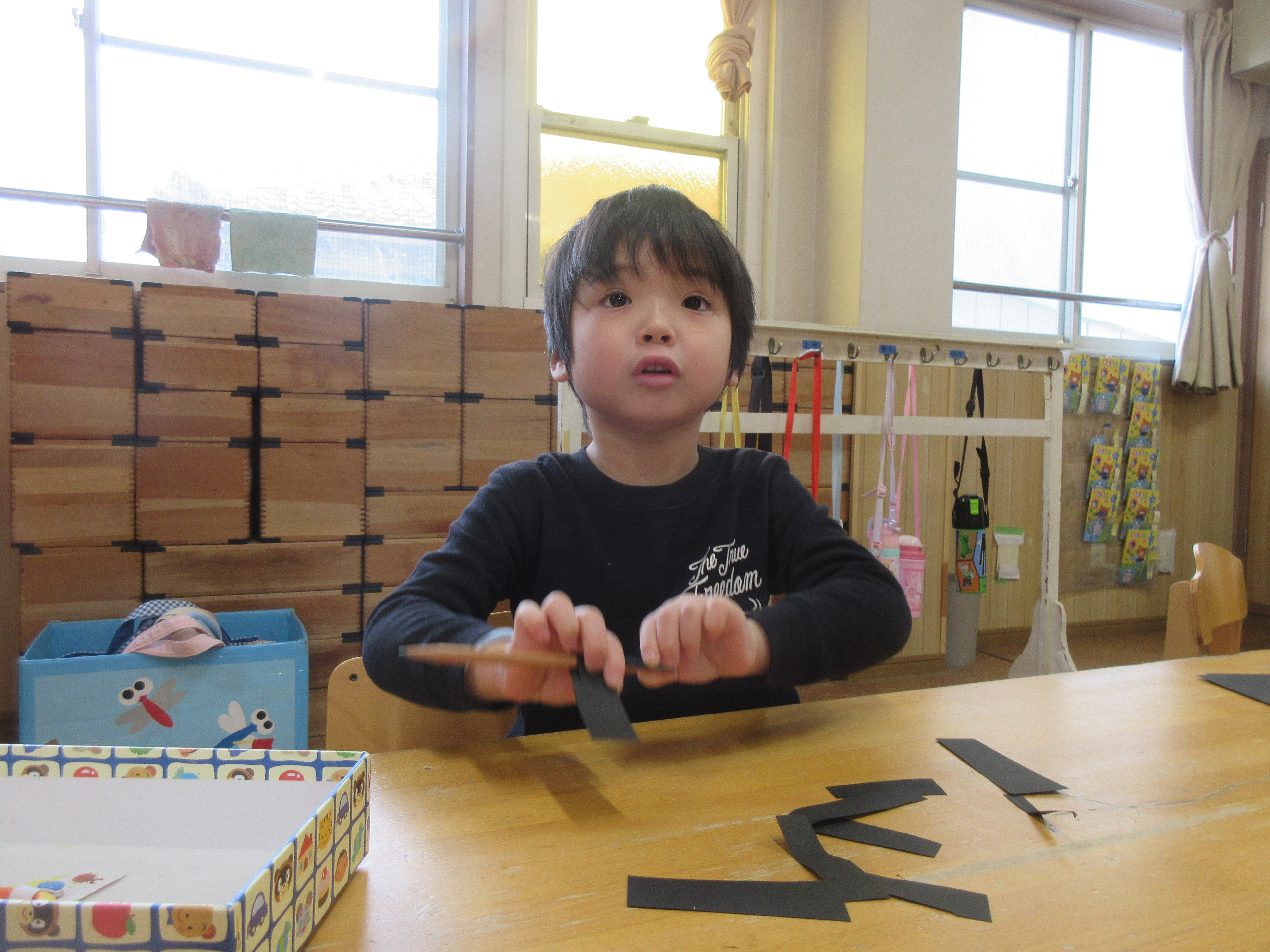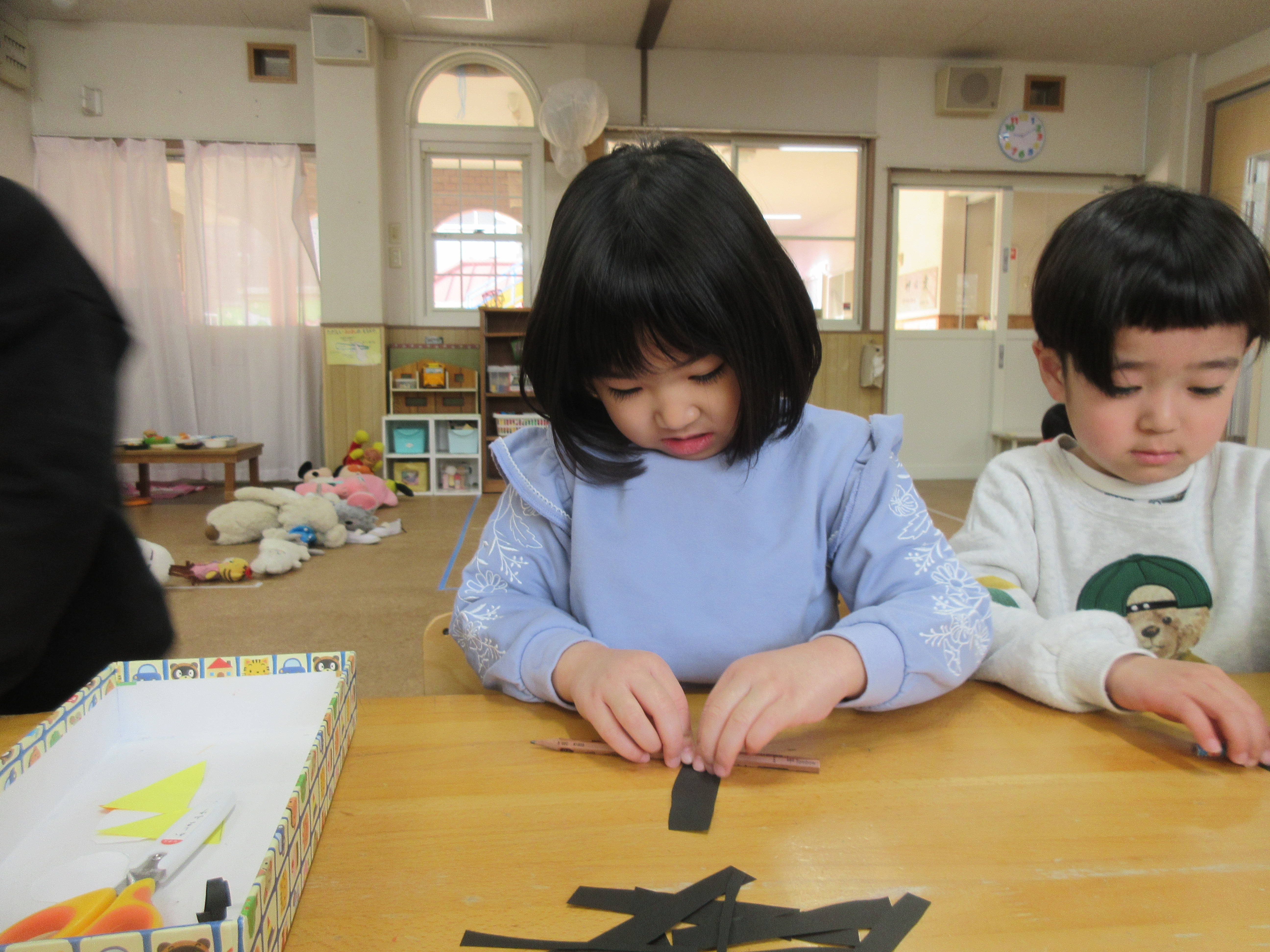今日は鬼面の髪の毛を作りました。画用紙を切った後は鉛筆でくるくる巻いていき、くるくるパーマの髪の毛の完成です!!みんな器用に巻けていました。明日顔に貼って完成です👹