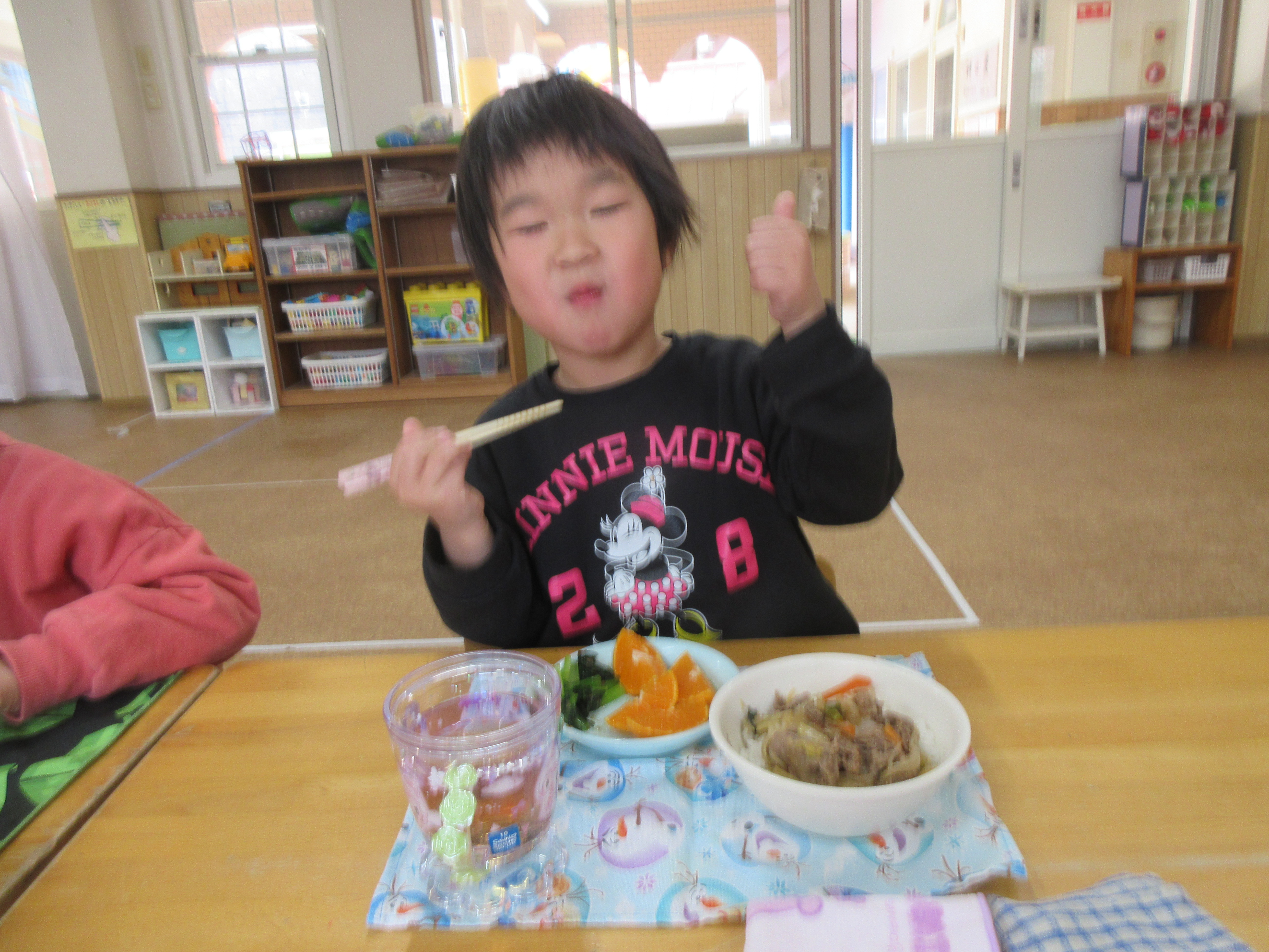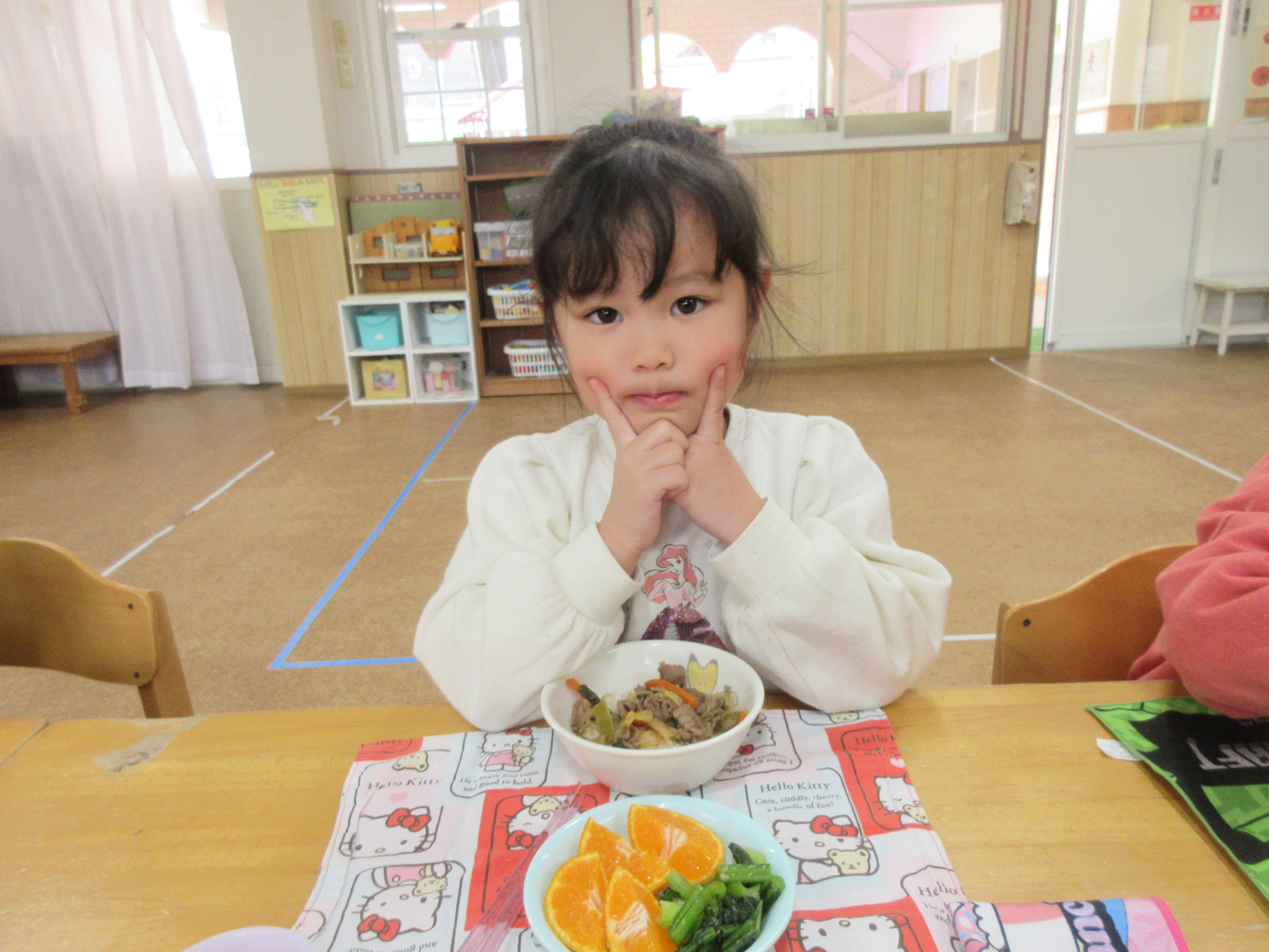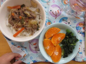 今日の給食は(2号認定)牛丼・お浸し・みかんでした。