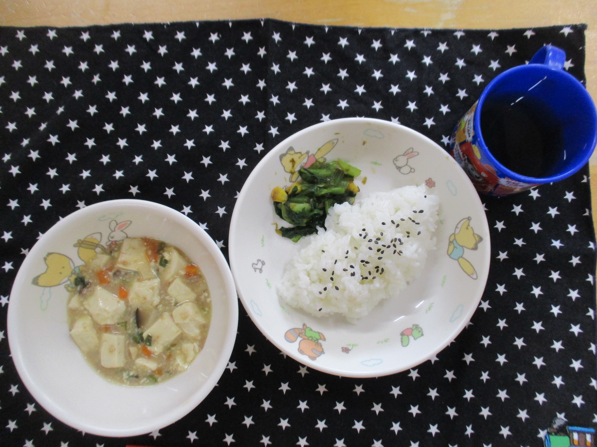 今日の給食は、ご飯・麻婆豆腐・のり和えです😊残すことなく沢山たべました✨