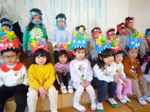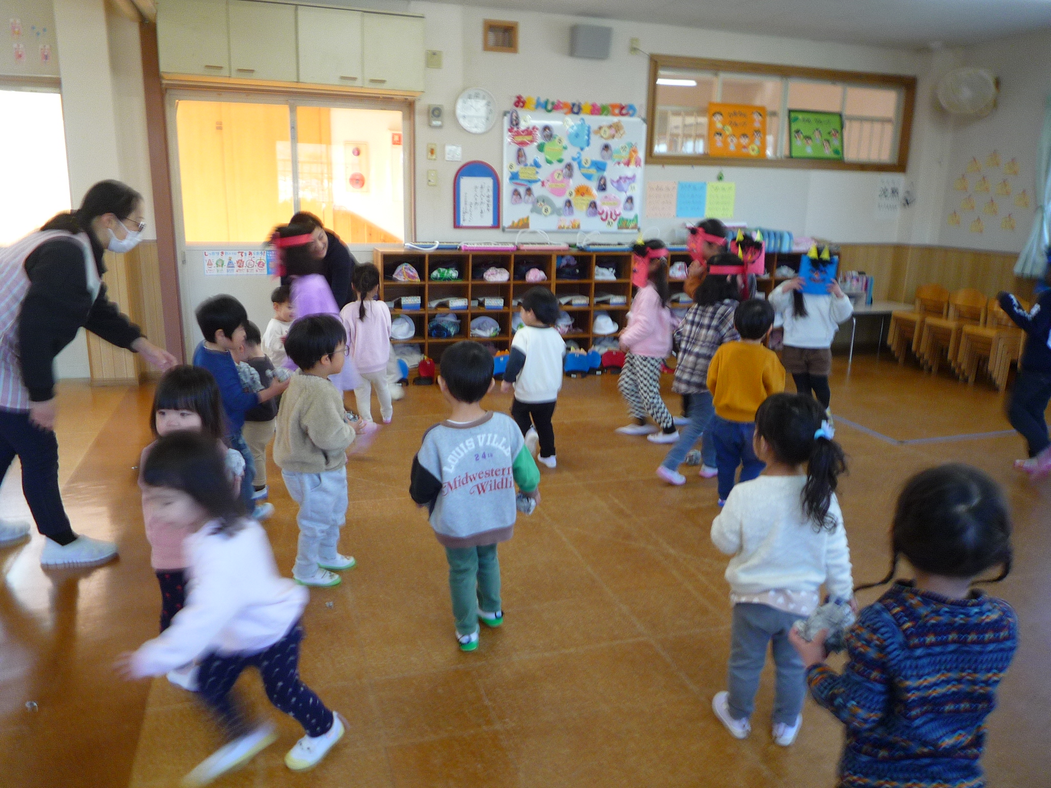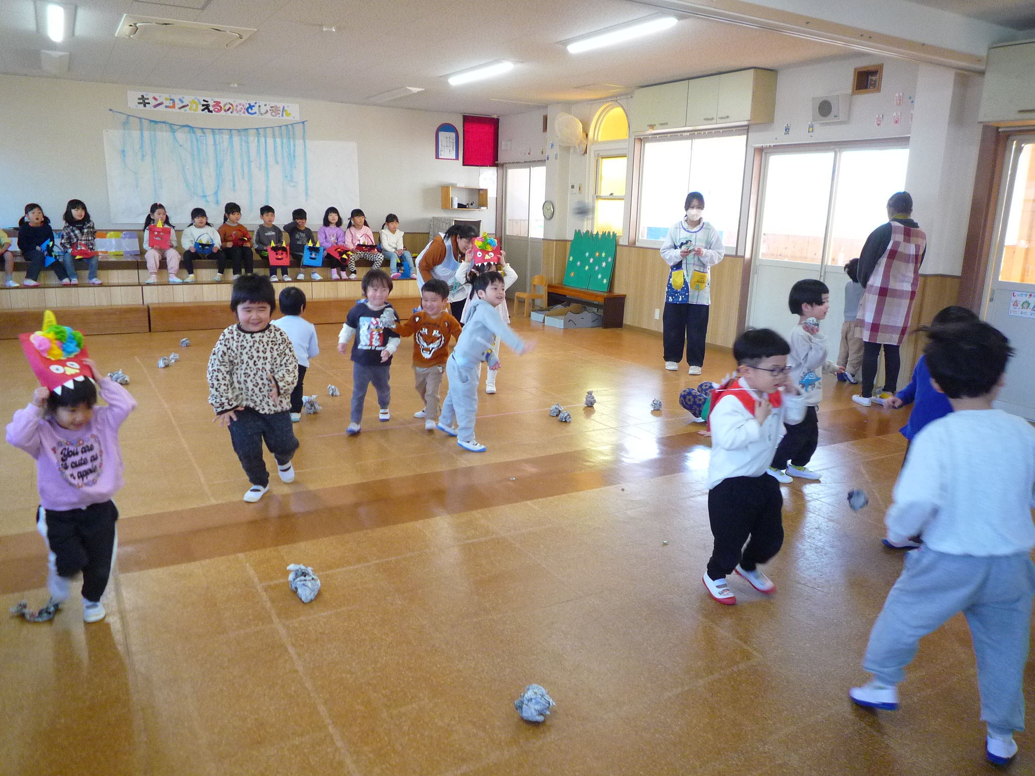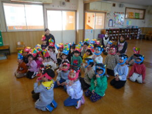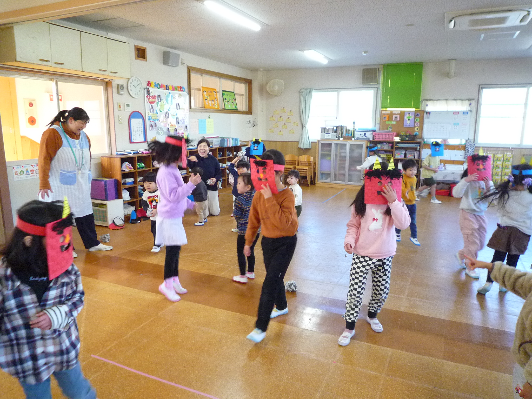 今日は、節分!自分たちで作った鬼面をかぶりみんなで豆まきをしました(^^)/交代で鬼になり豆まきをしました!元気いっぱい走り回る子どもたちです(^▽^)/本日鬼面を持ち帰っていますのでお家でも是非、豆まきして見てください♪