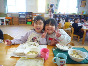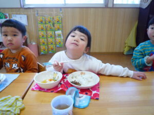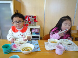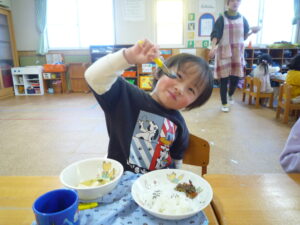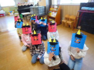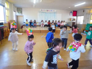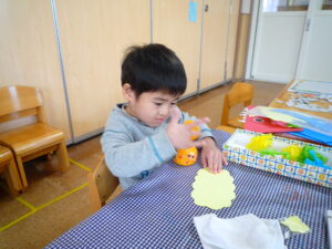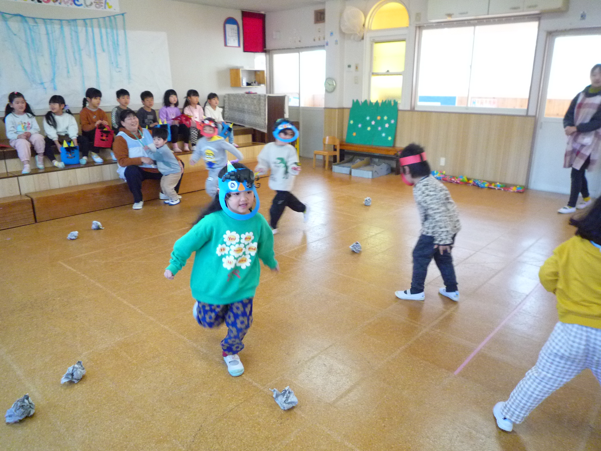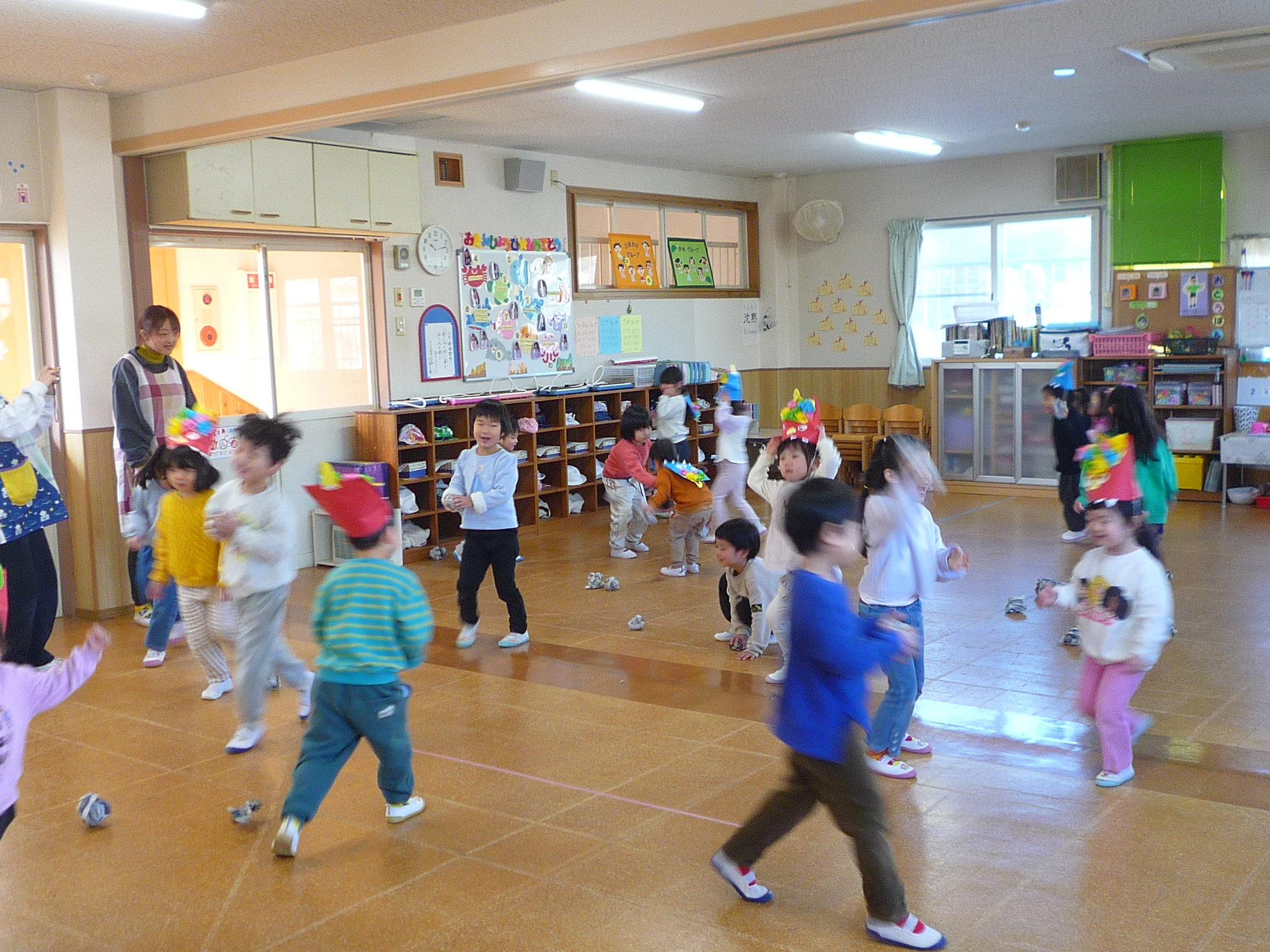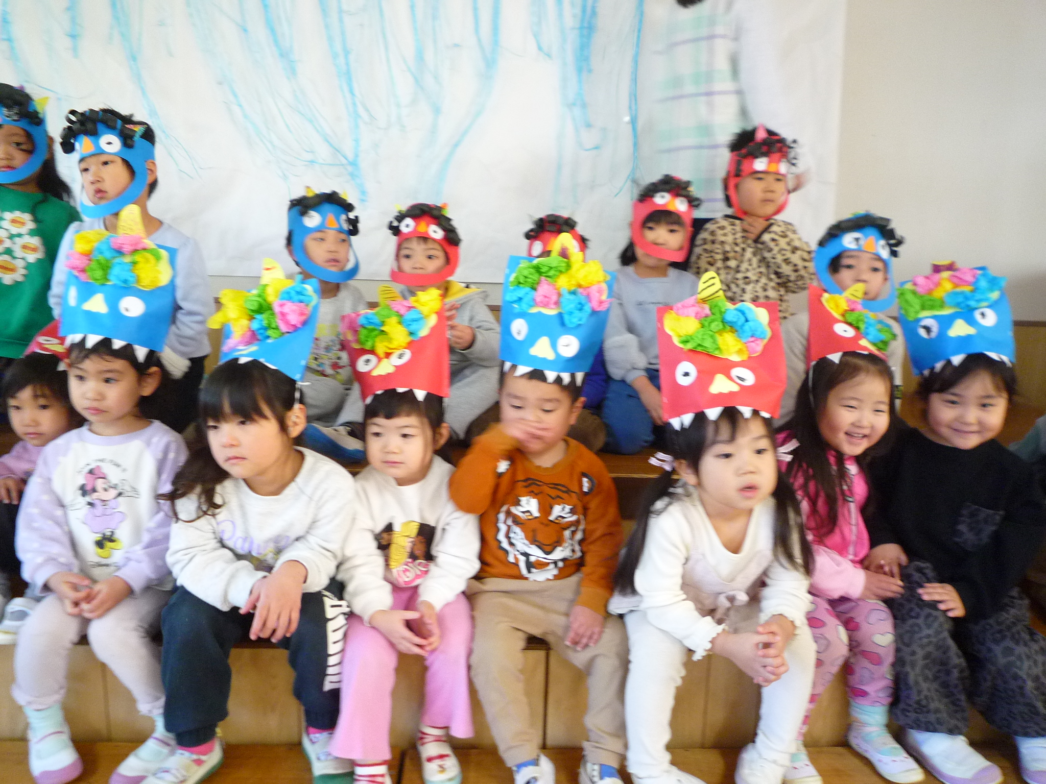 今日は、節分!自分たちで作った鬼面をかぶりみんなで豆まきをしました(^^)/交代で鬼になり豆まきをしました!元気いっぱい走り回る子どもたちです(^▽^)/本日鬼面を持ち帰っていますのでお家でも是非、豆まきして見てください♪