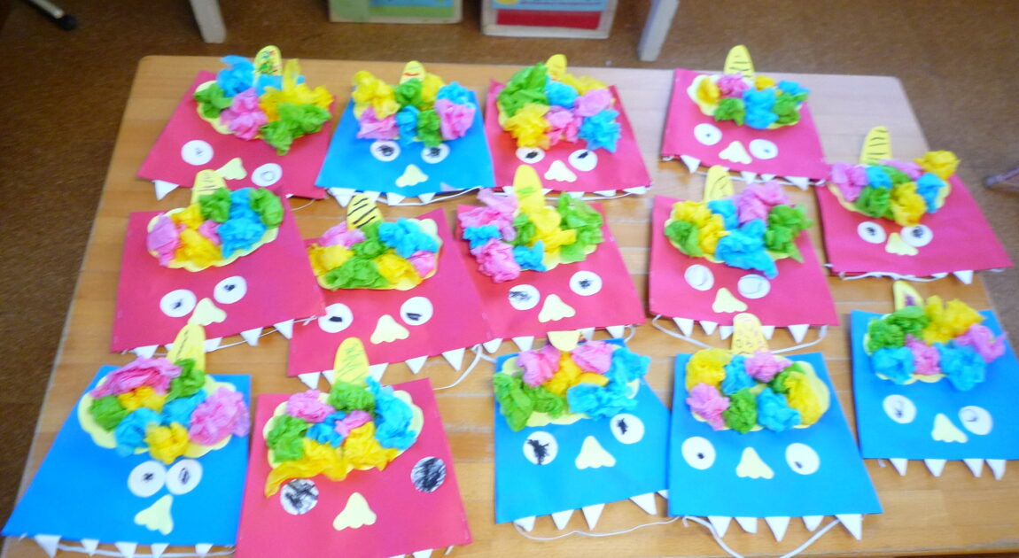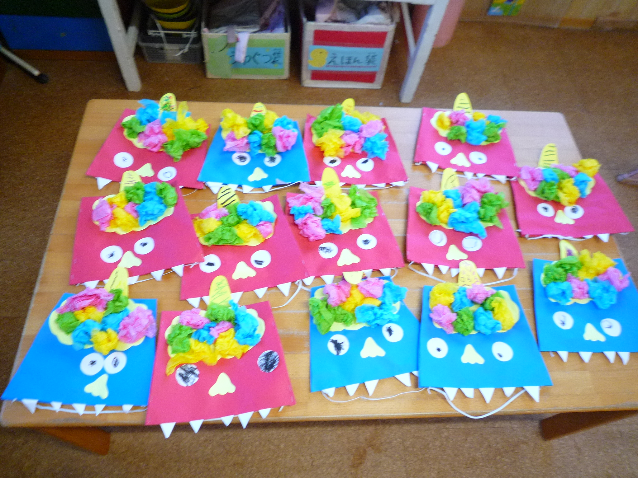鬼面製作の様子です!どうすれば怖い鬼になるかなと考えながら作っていました♡一人ひとり素敵な鬼面が完成しました(^^♪