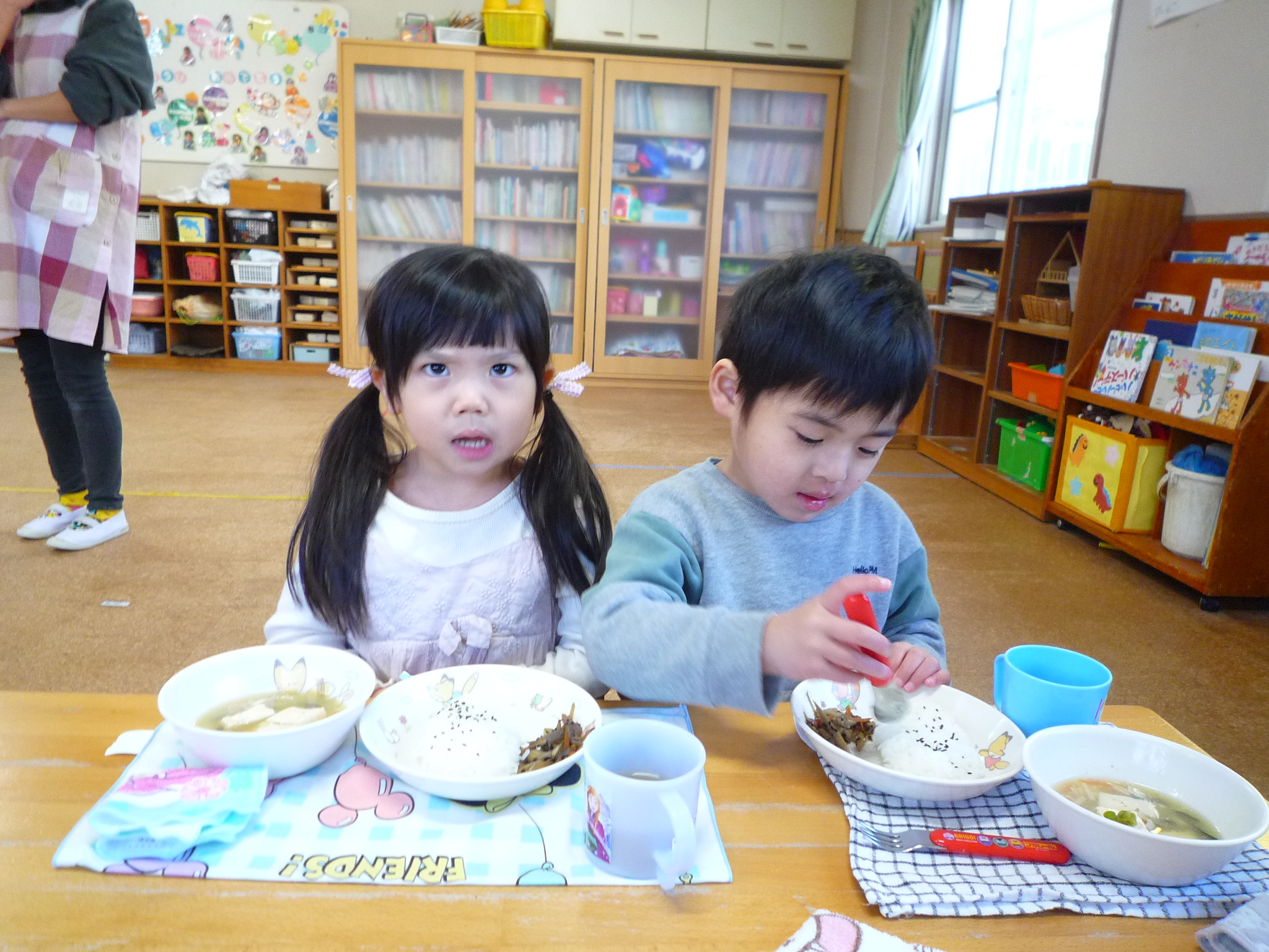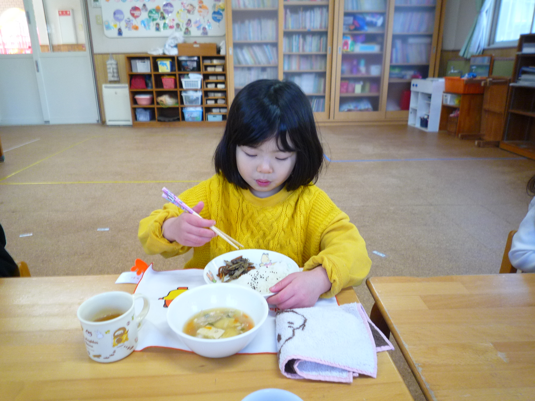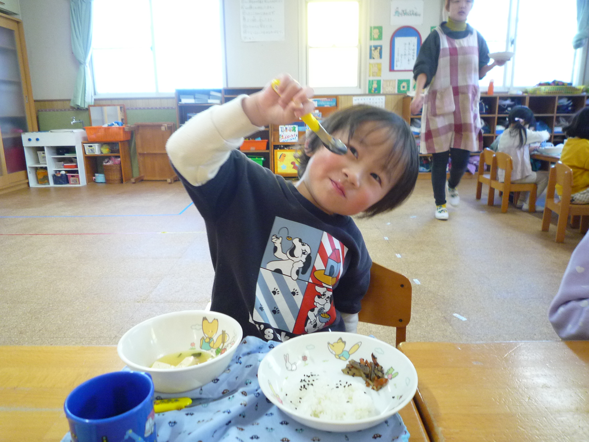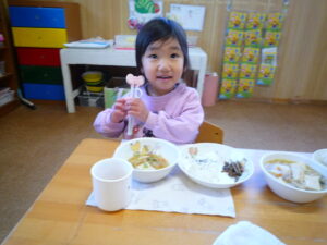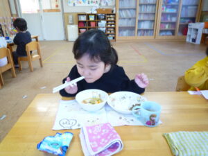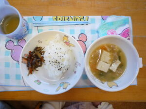 今日の給食は、ごはん・豆腐と豚のスープ・きんぴらでした(^^)/