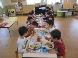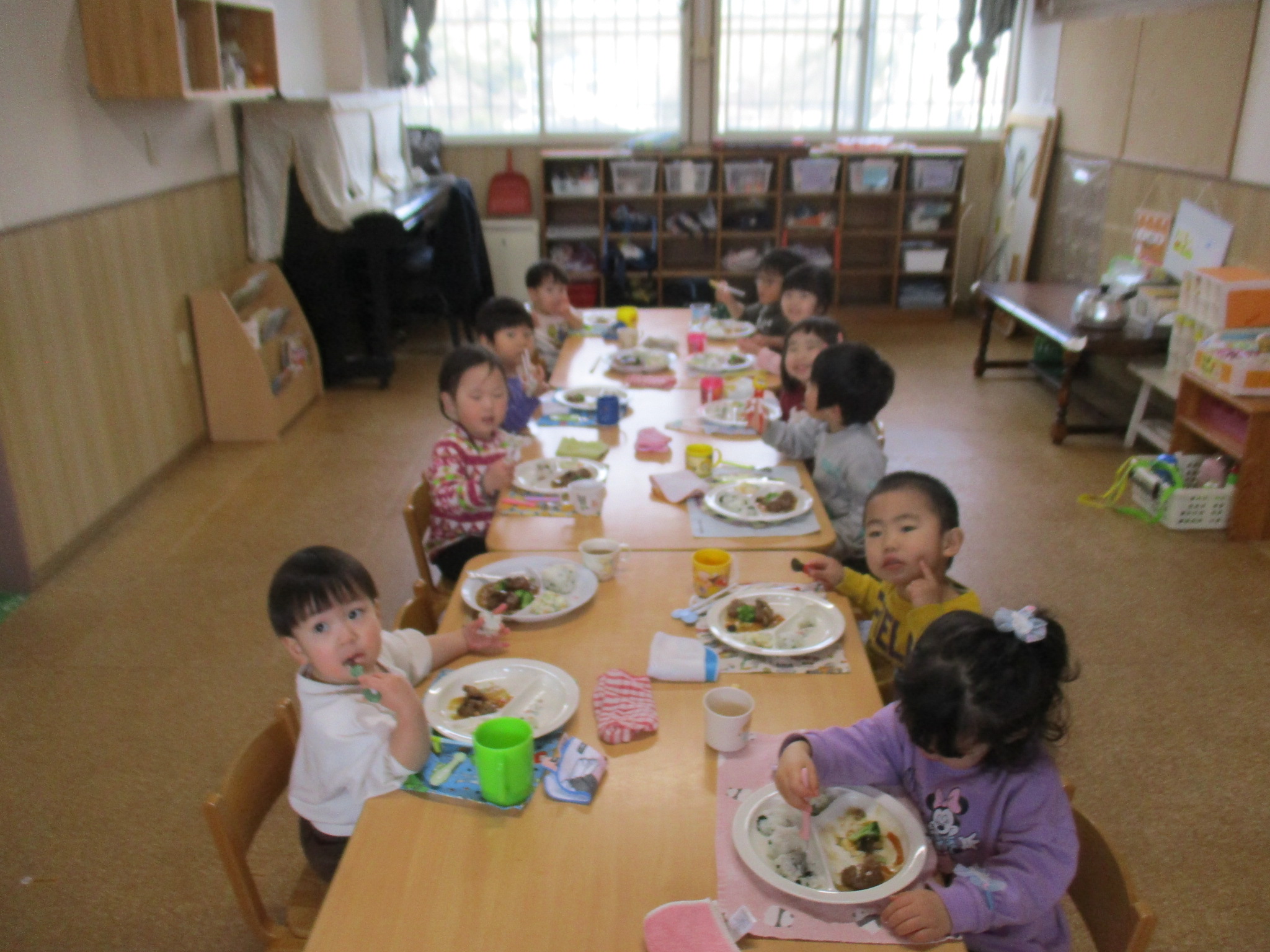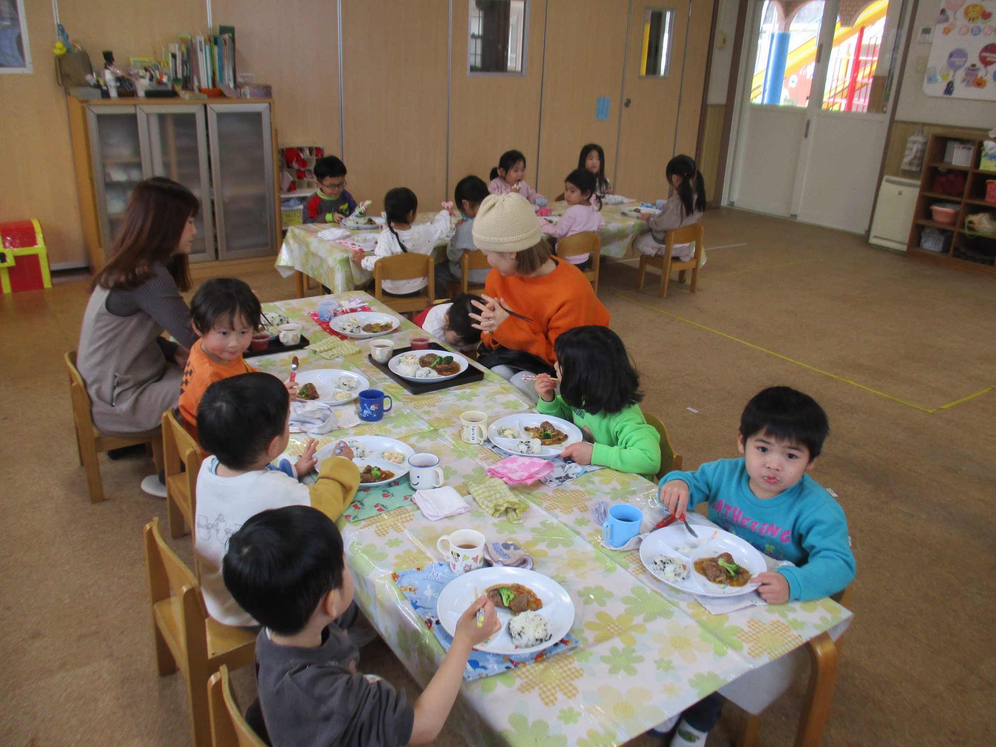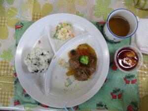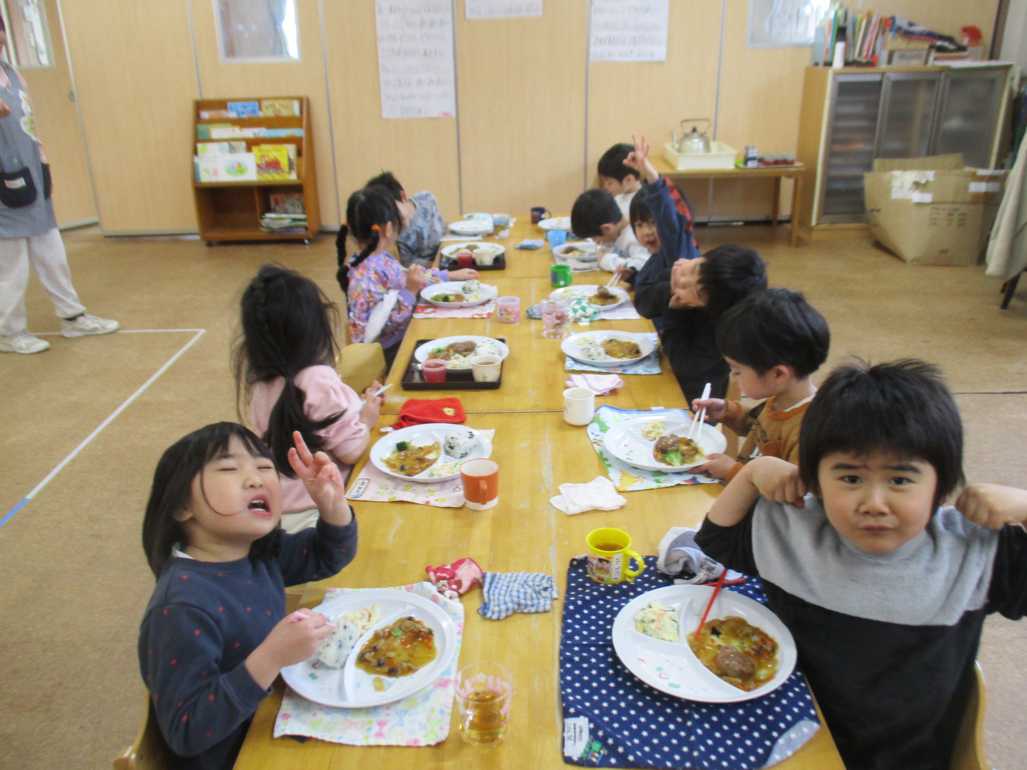 今日の給食は、おにぎり・煮込みハンバーグ・サラダ・ゼリーです😊2月生まれのお友だちはお家の方と一緒に給食を楽しく食べていました✨