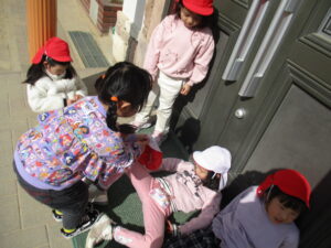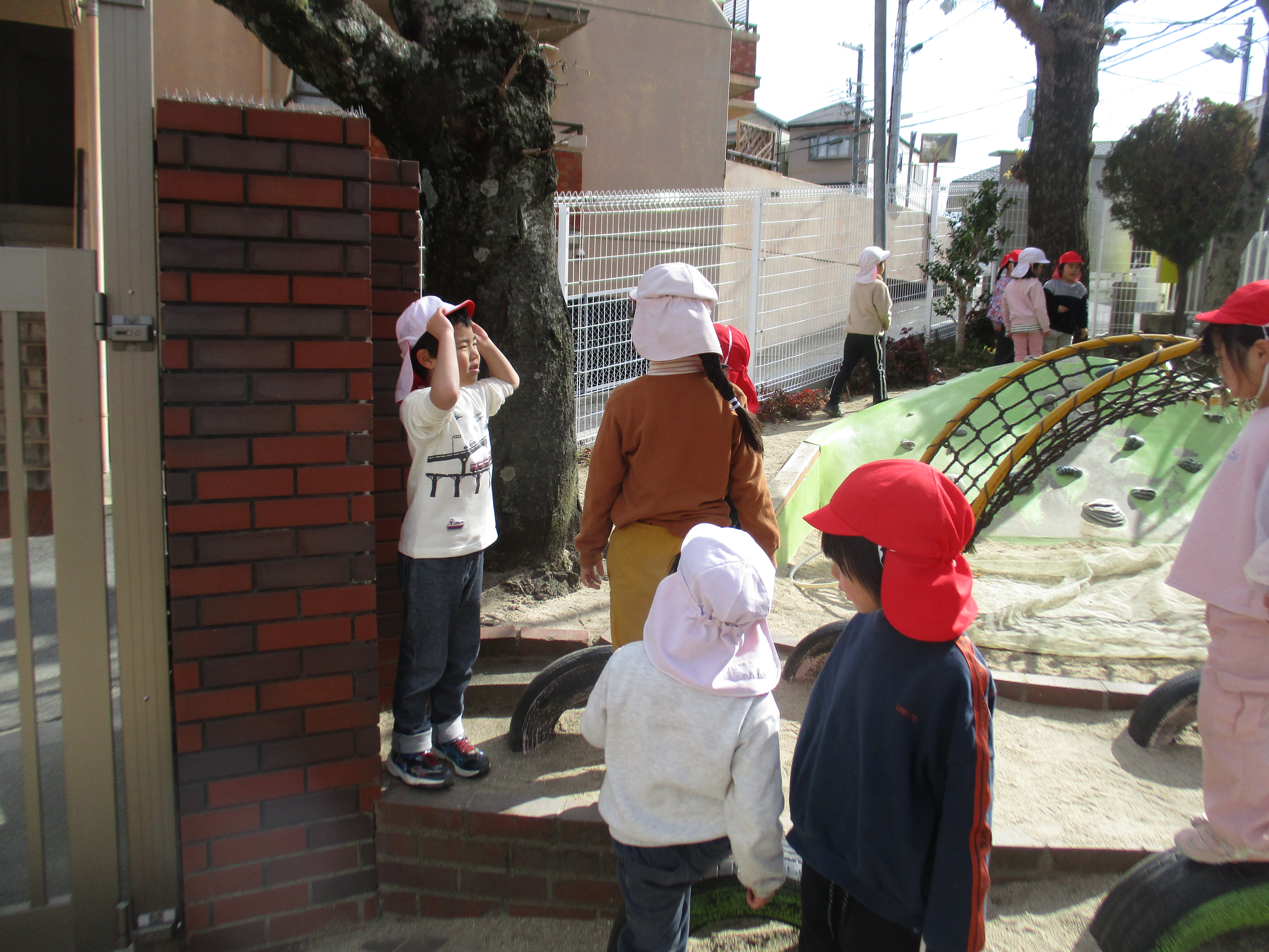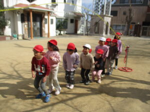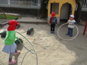 給食の後は、お外遊びに行きました。ゆり組とすみれ組は長縄跳びをしている子や、鬼ごっこをしていました。たんぽぽ組さんは、フラフープで砂を集めて工事中に見立てながら遊んでいました😊