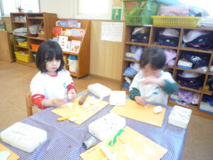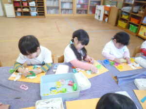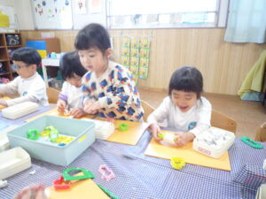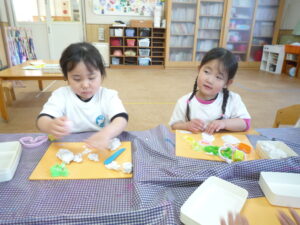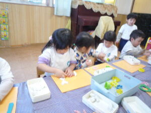 お部屋に入ってからは、粘土あそびをしました(^^♪今日は食べ物をテーマにいろんなものを作りました♬チョコレートやピザ、ハンバーガーなど子どもたちの好きなもの作って楽しかったね(^▽^)/