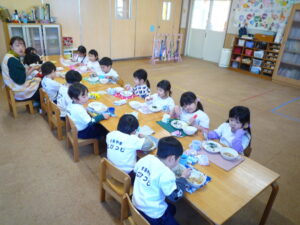 今日の給食は、ごはん、すき焼き風煮、春雨でした!最近は目標時間を決めていて、何時までに終わったら、小学生、ゆり組、すみれ組、たんぽぽ組と目標時間ごとにクラスを伝えています♫早くたばられた日は「今日は小学生の時間に終わったよ」と嬉しそうです♡