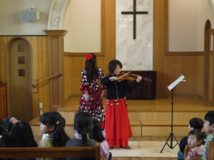 本日は、尚美先生のピアノと、ご友人のゆうかさんのバイオリン、そして、たまごクラブに通って下さっているママのフラメンコとのコラボレーションで、コンサートをさせていただきました!1曲目の情熱大陸のテーマ曲は、優しくも力強い音色のピアノとバイオリンに、情熱的なフラメンコが合わさって、かっこよさに一気に引き込まれました!!2曲目の熊木杏里さんの誕生日は、演奏と踊りから優しさが伝わってきて、会場が温かい雰囲気に包まれていました♡尚美先生のご主人も歌で参加して下さり、ご夫婦の歌声にとても癒された時間でした♪