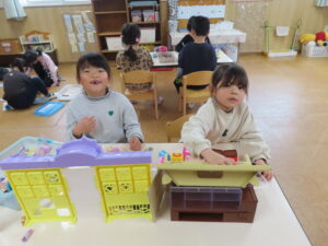 男の子、女の子わきへだてなく、なかよく遊べるゆりぐみさん。それぞれ楽しそうに遊んでいたよ!!
