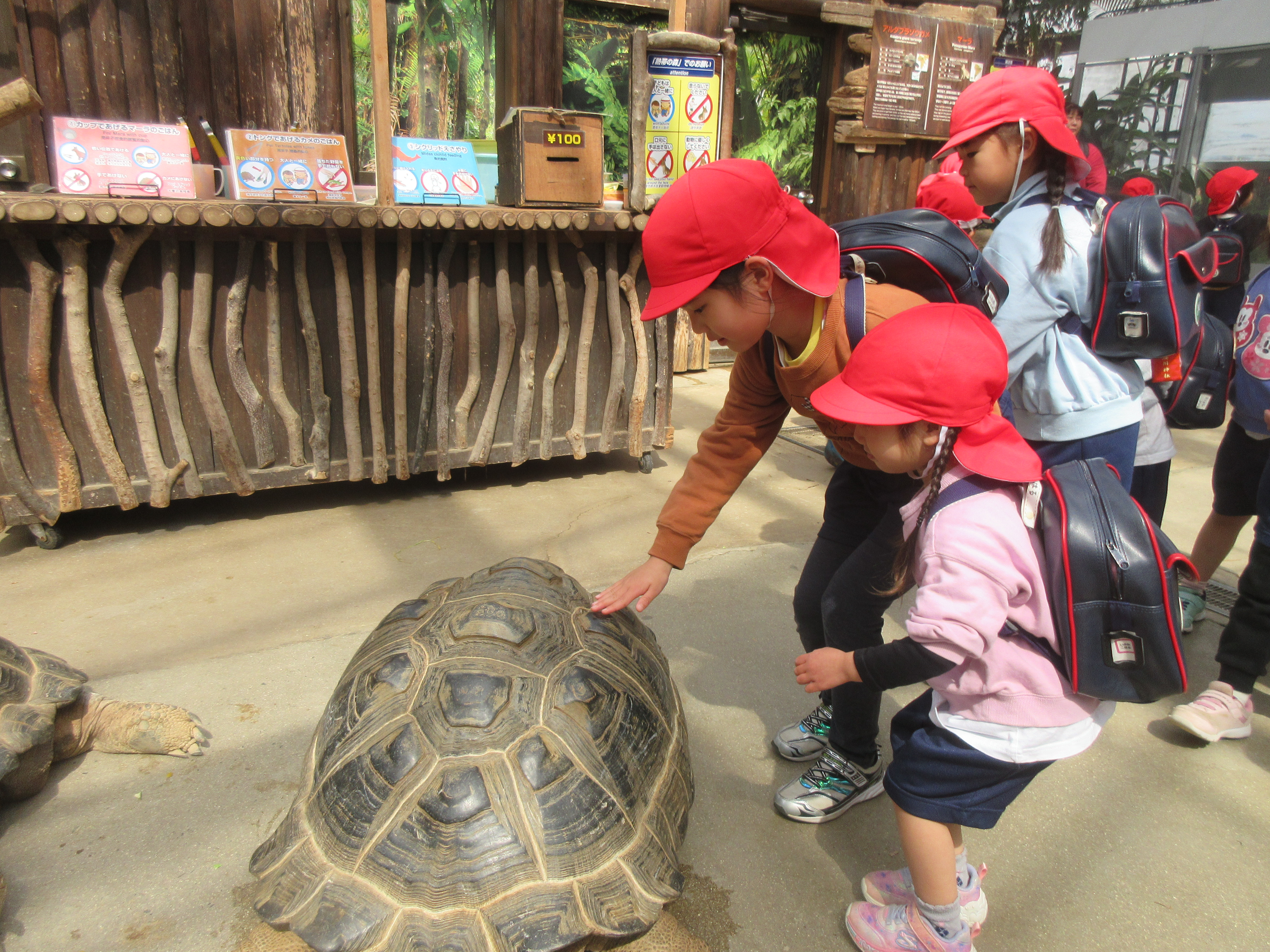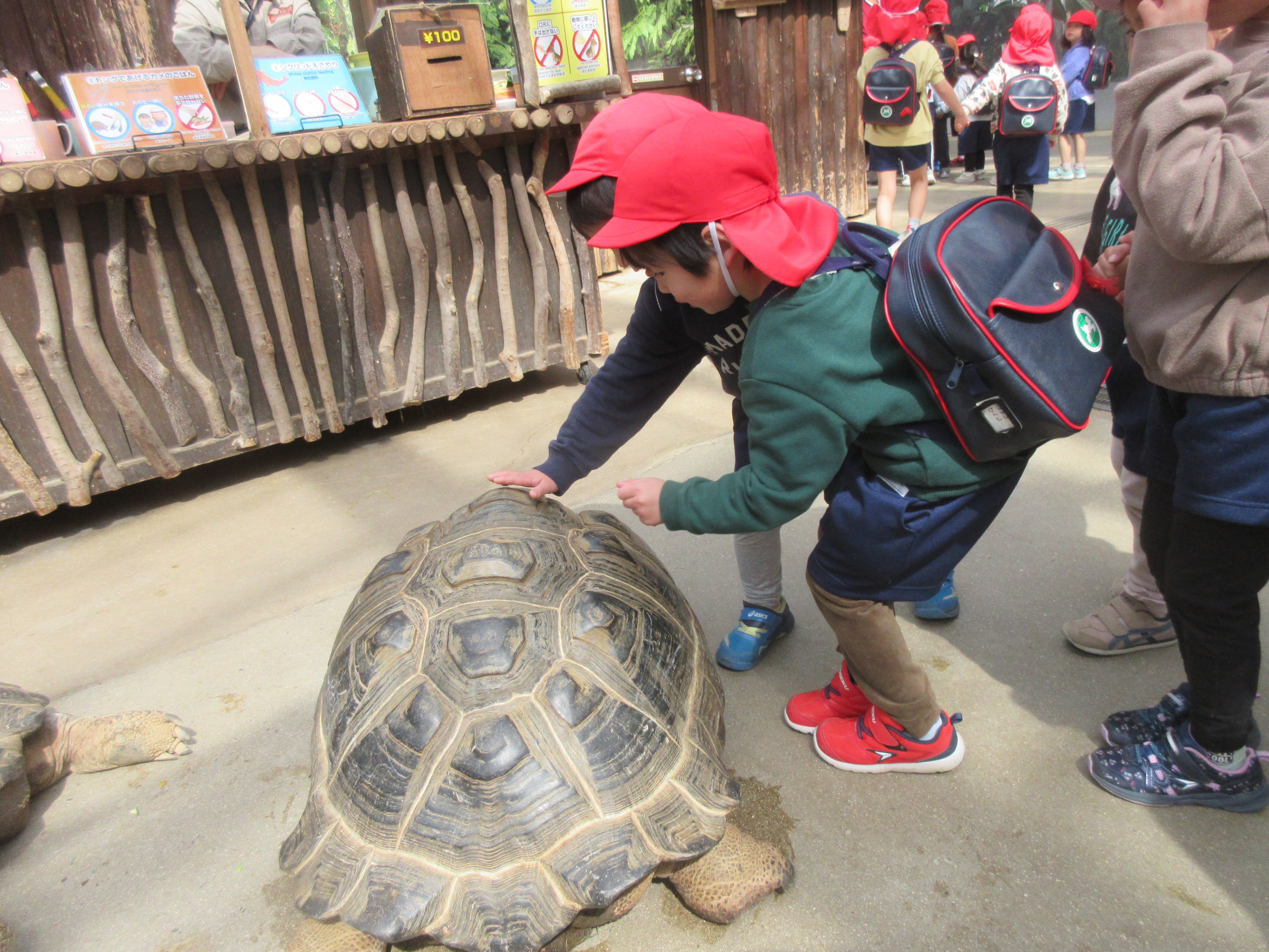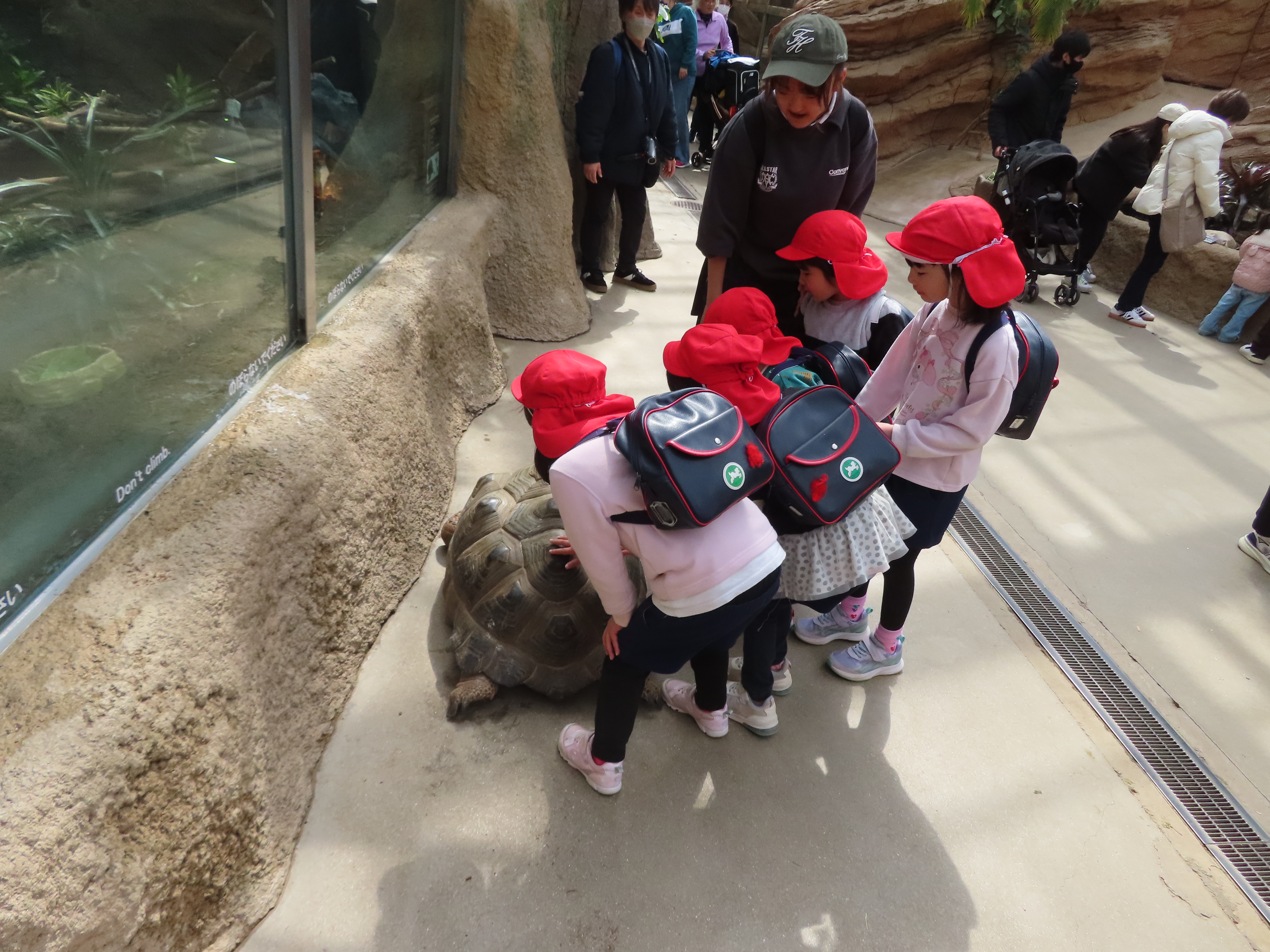 奥に進むと、カメさんが歩いていました✨怖いと言いながらもカメさんに触れると「固い!」「つるつるしてる!」と、とても嬉しそうでした😊