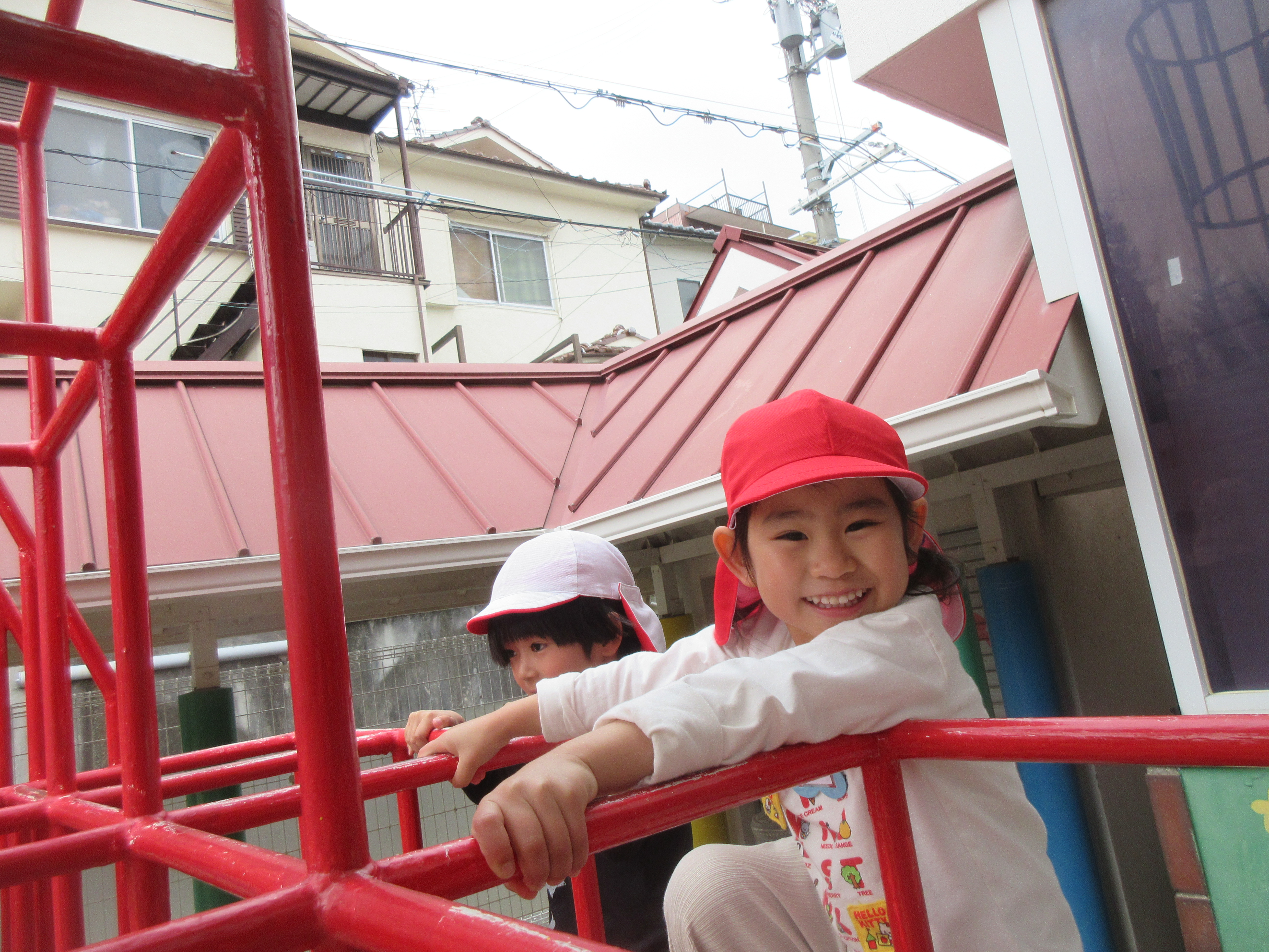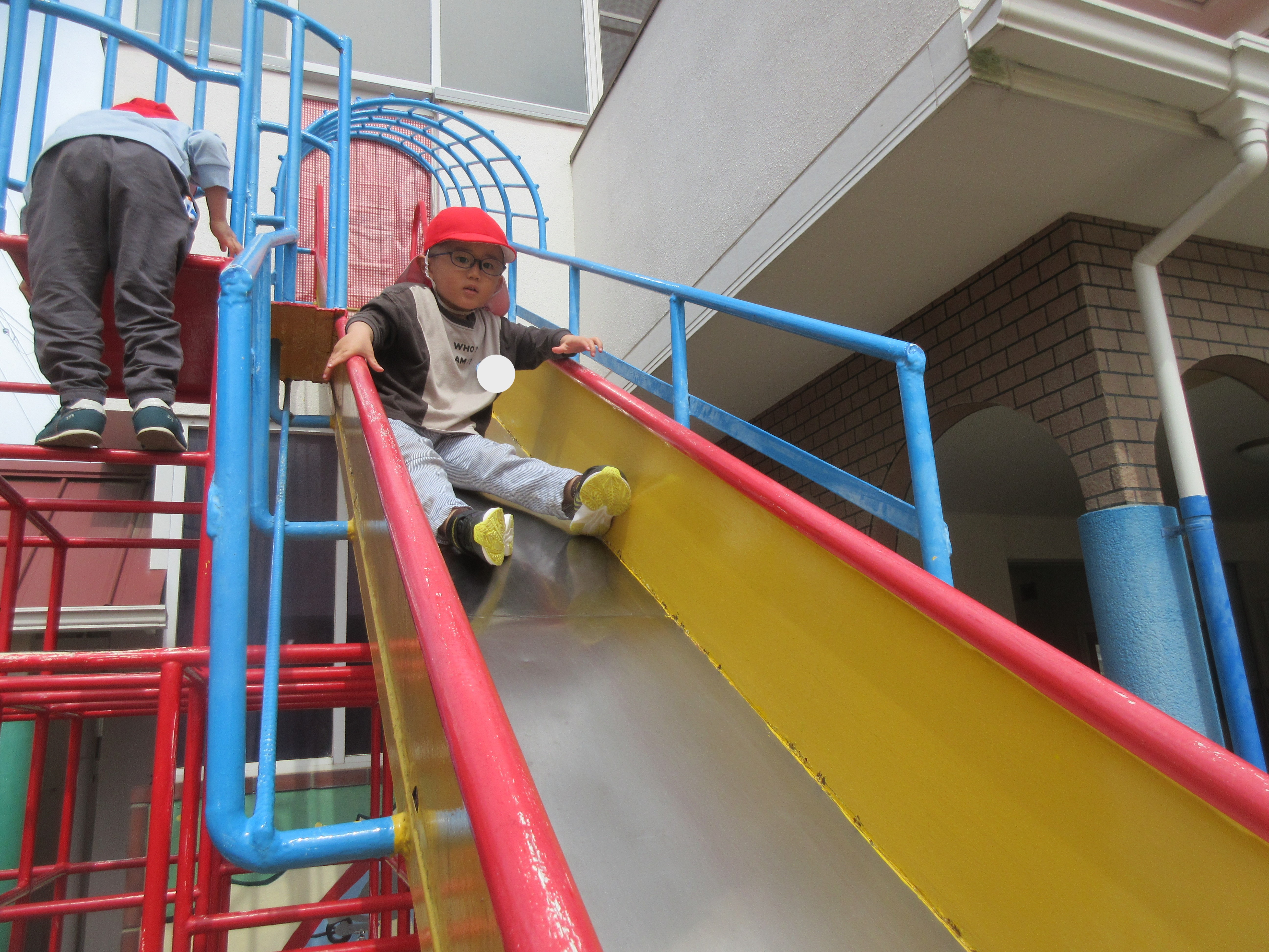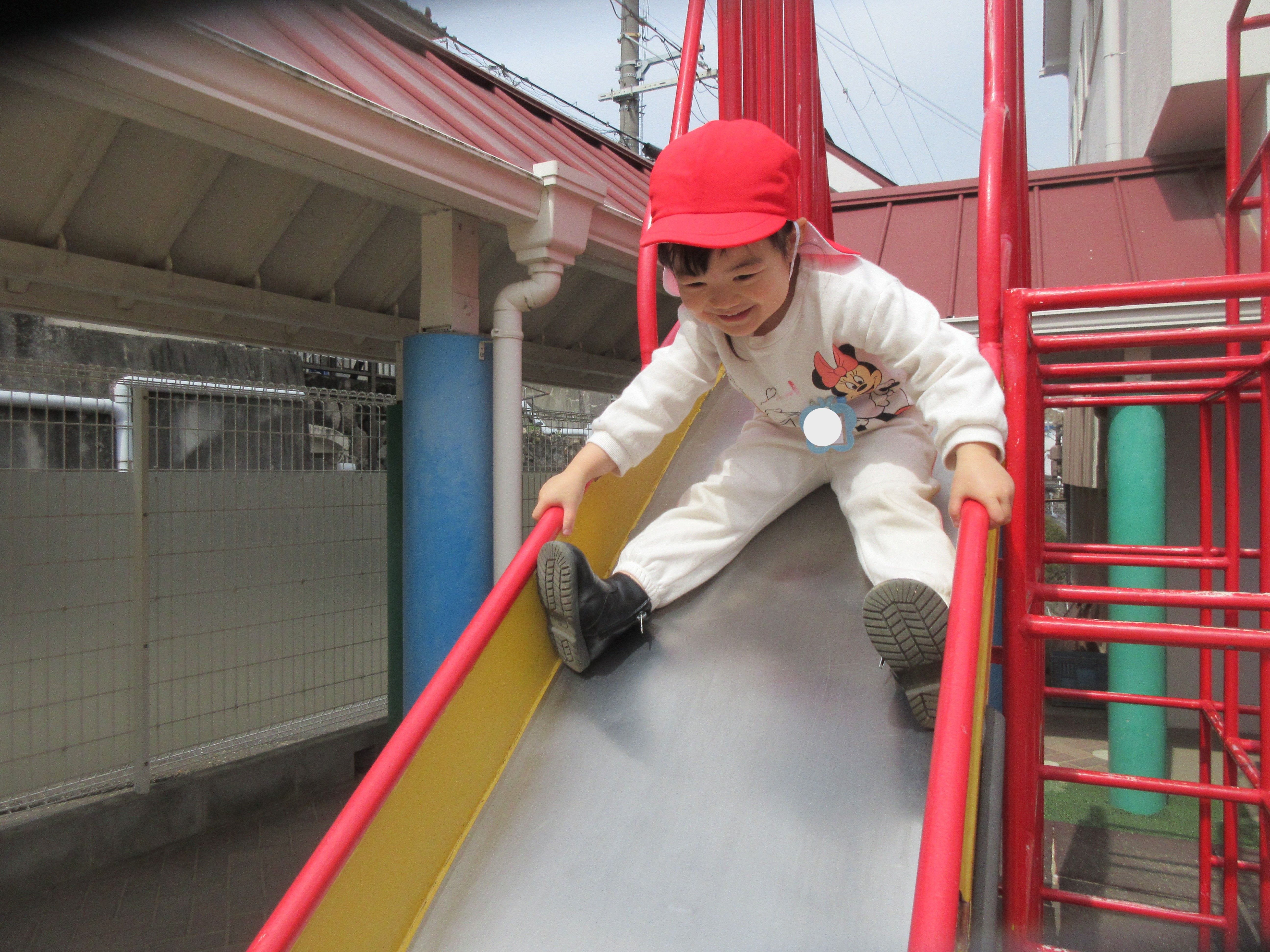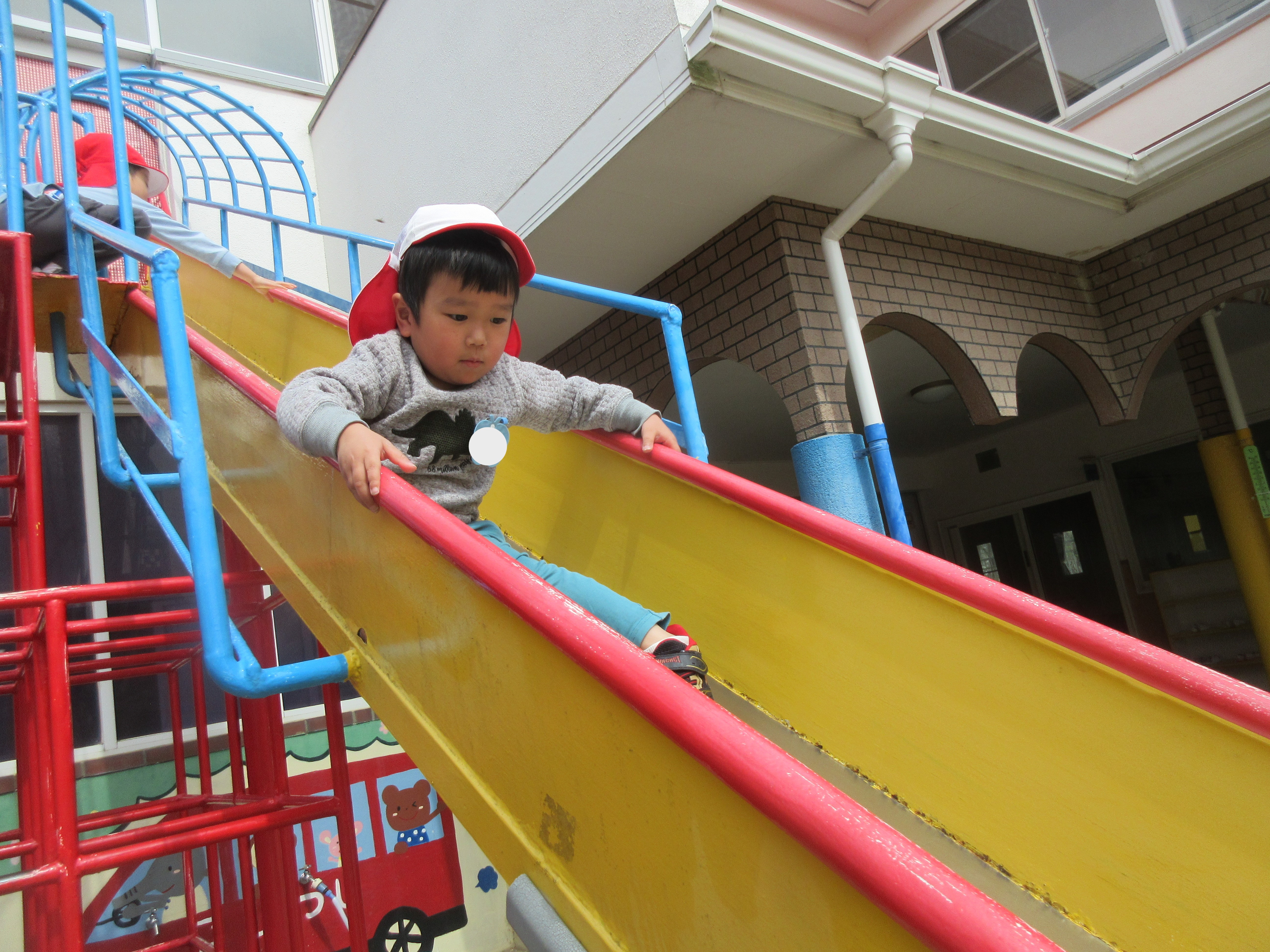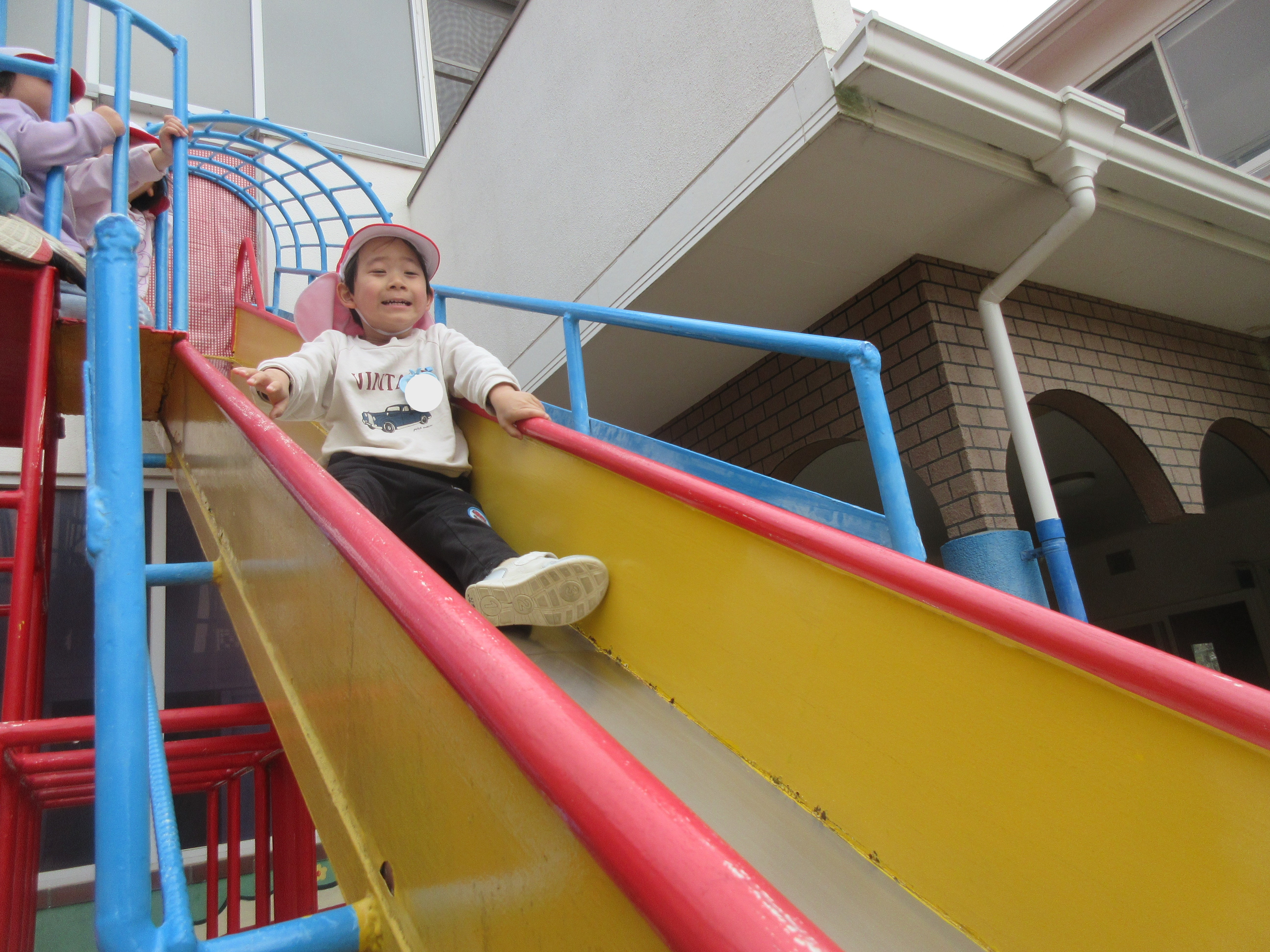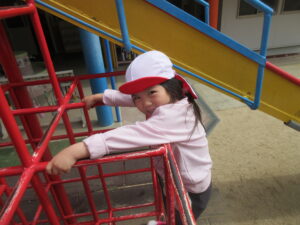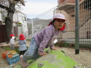 お外遊びでは桜の花弁を集めや、ジャングルジムを何回も登り大きな滑り台を「きゃーー」と声を上げてするこどもたちです!