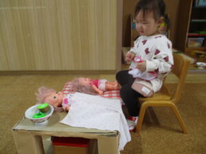 「メルちゃんにミルク飲むかなぁ・・」「ごはんできたよ」